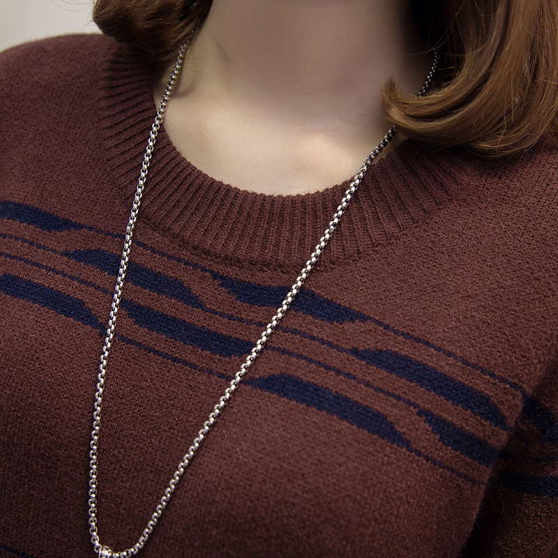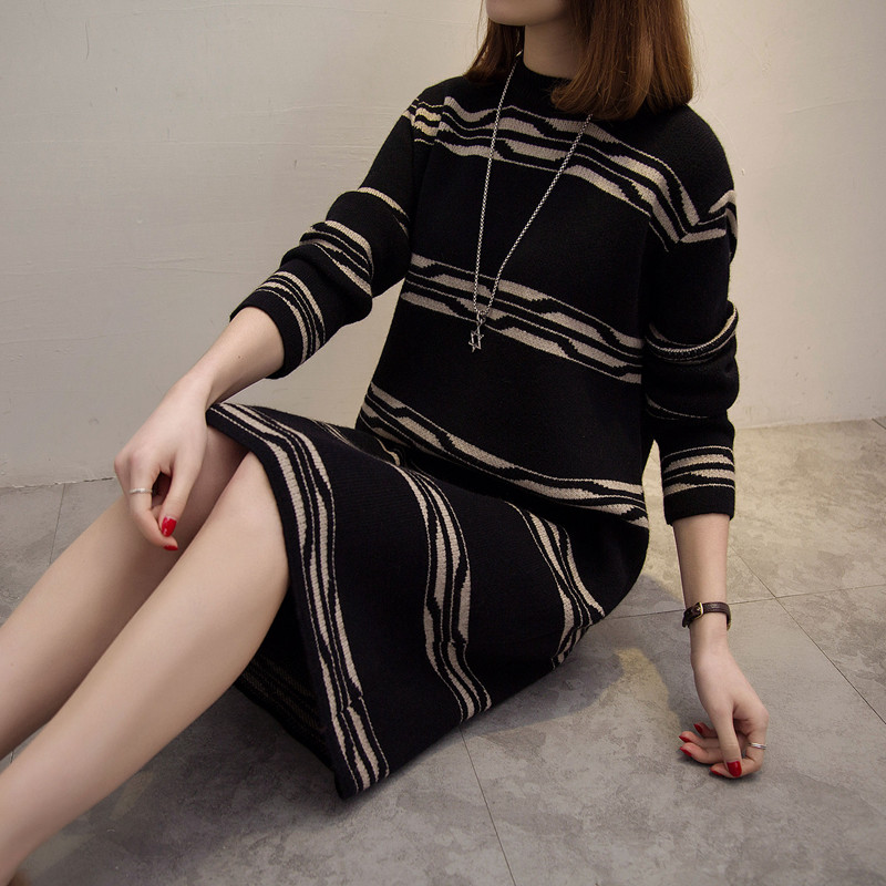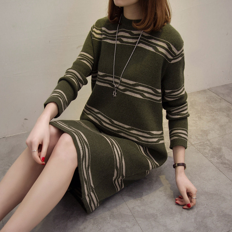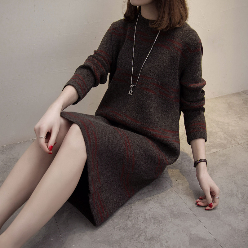 / 中長款套頭圓領韓版寬松拼色針織秋冬季打底衫女毛衣裙外套毛線衣