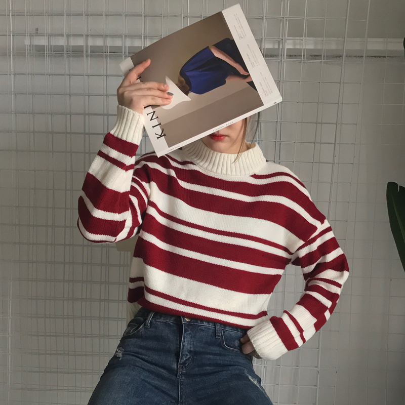 / 秋季女裝韓版學院風寬松條紋半高領套頭毛衣學生長袖針織衫上衣潮