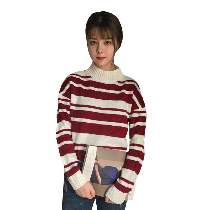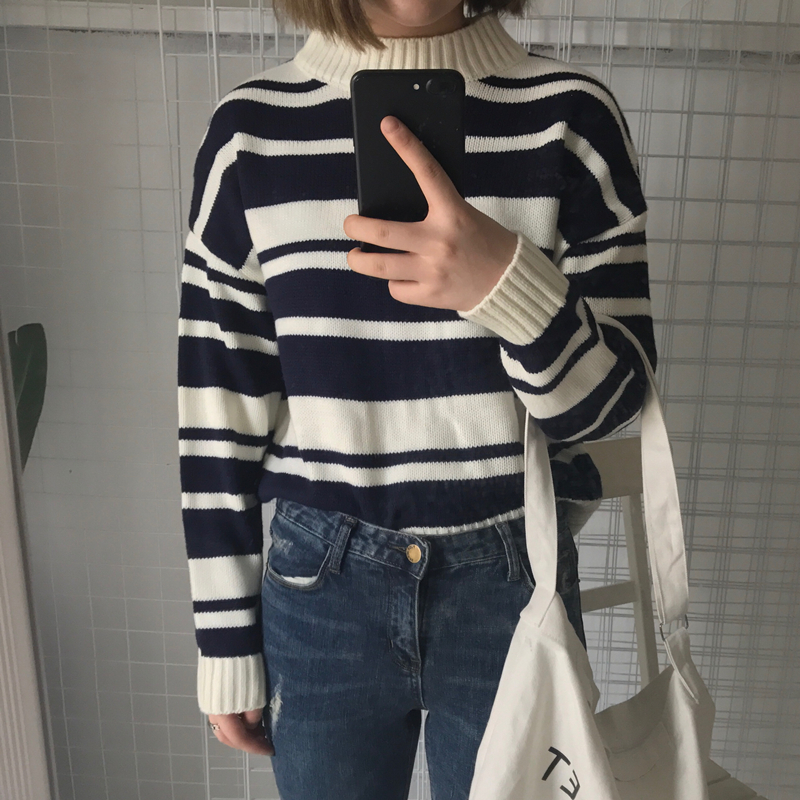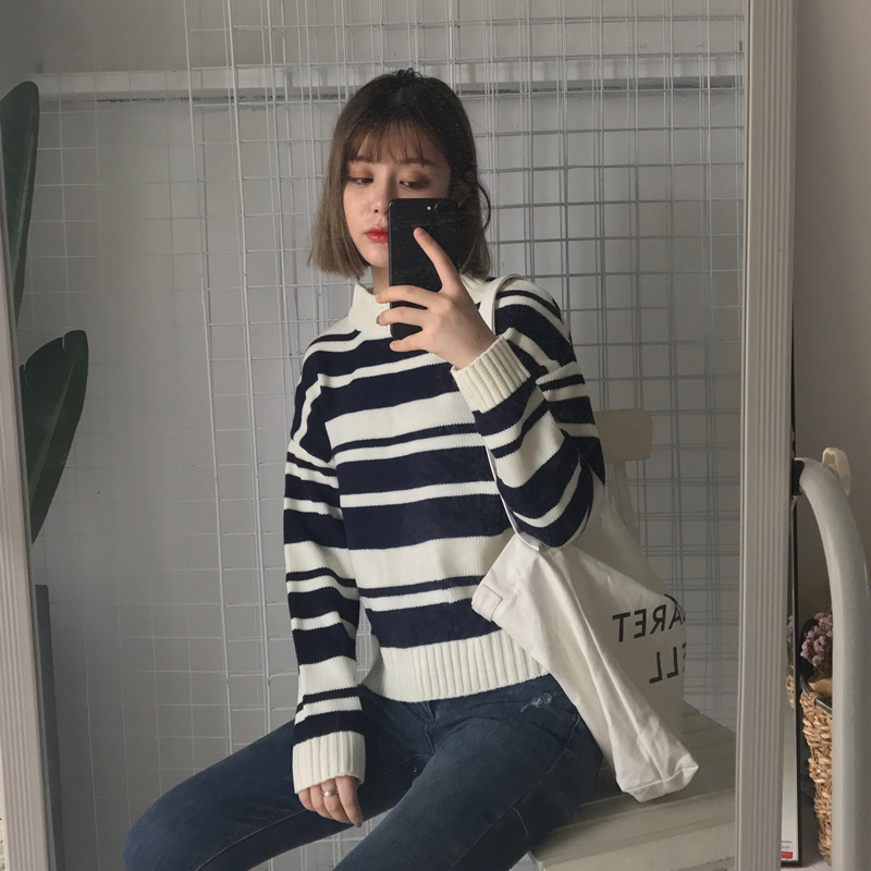 秋季女裝韓版學院風寬松條紋半高領套頭毛衣學生長袖針織衫上衣潮