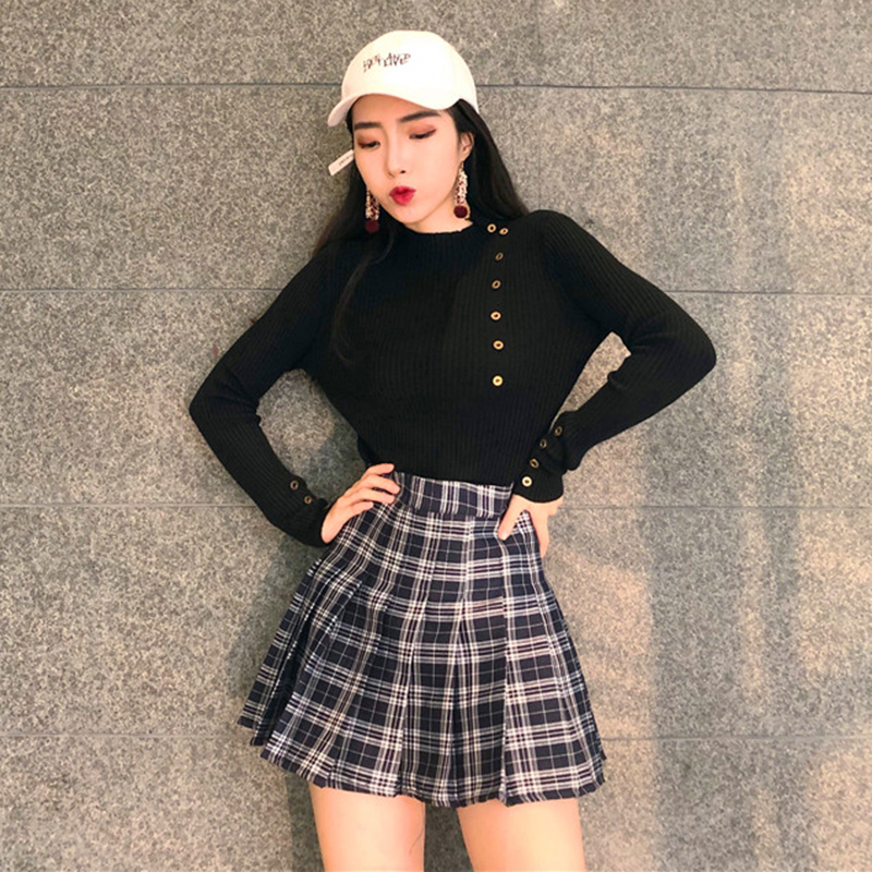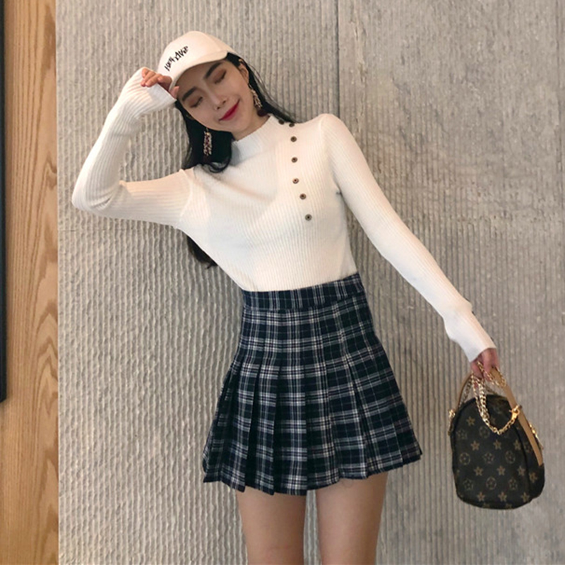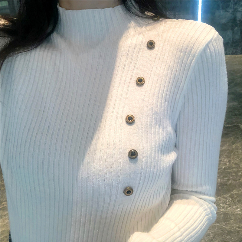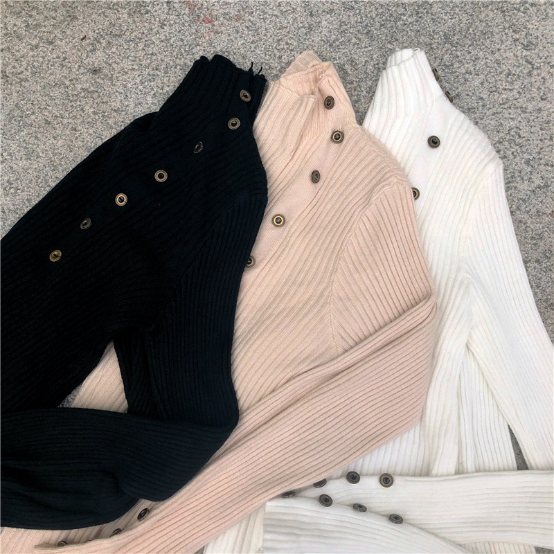 / 時尚顯瘦彈力打底衫秋裝新款修身半高領紐扣針織上衣百搭長袖女裝