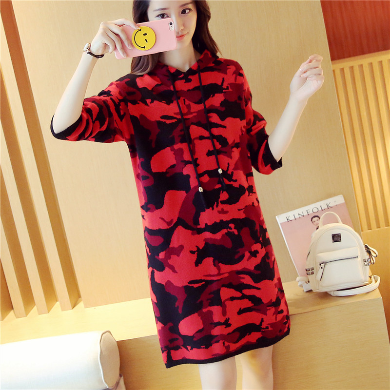 / 女裝冬裝新款潮迷彩針織衫套頭連帽外套毛衣女秋冬上衣中長款