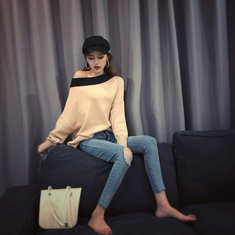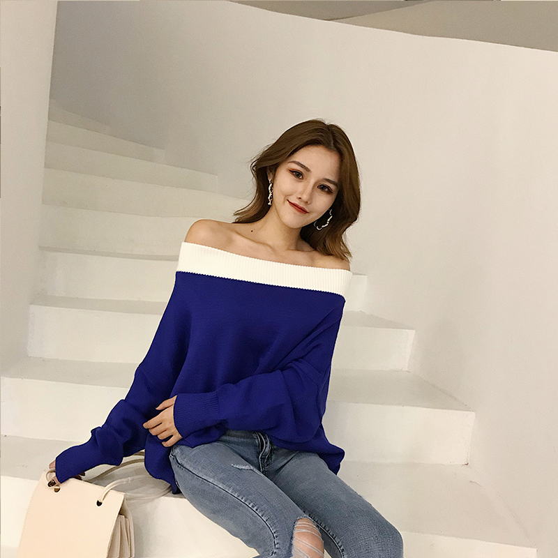 / 中長款一字領長袖寬松毛衣百搭慵懶新款秋季韓版chic小心機上衣女