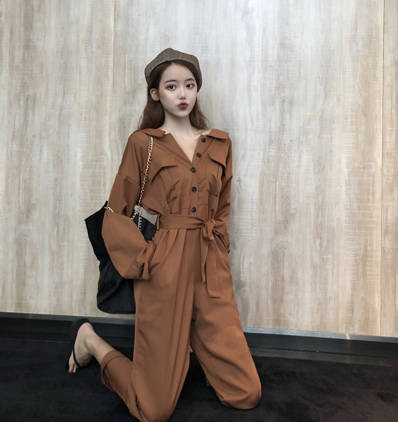 新款純色多穿法露肩翻領OL西裝小清新時尚百搭復古chic連體褲女潮
