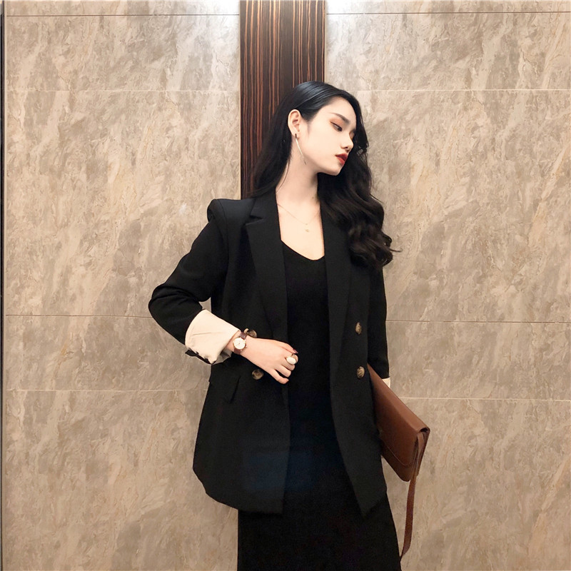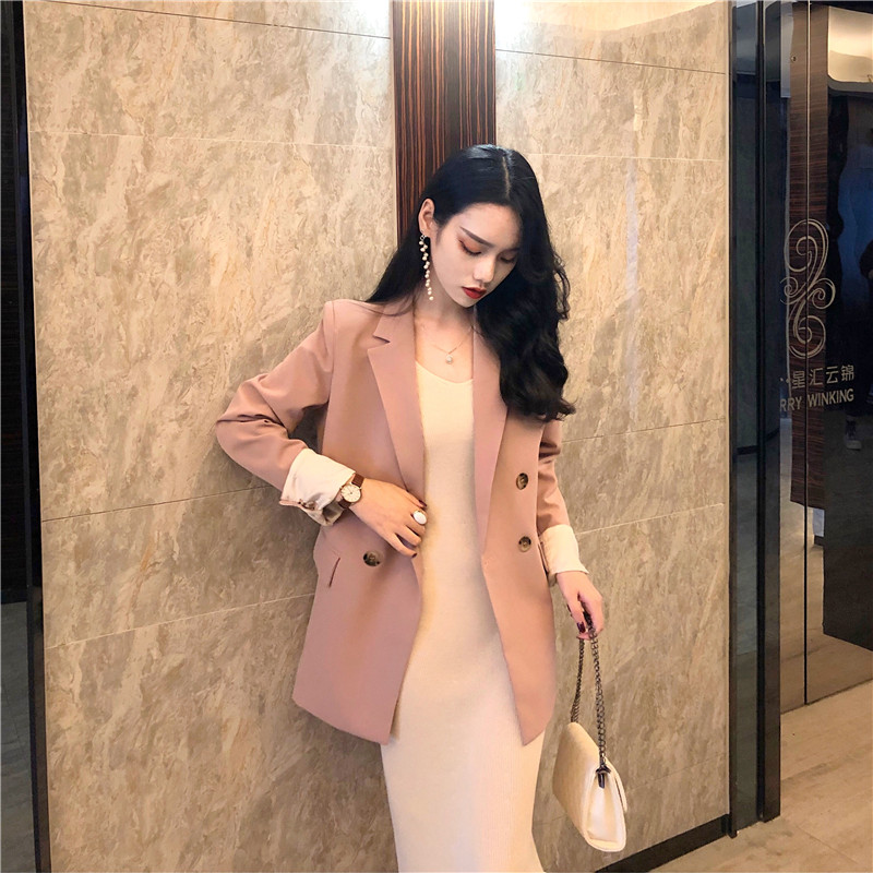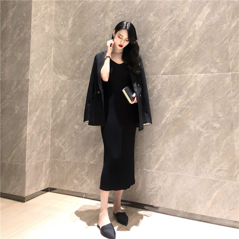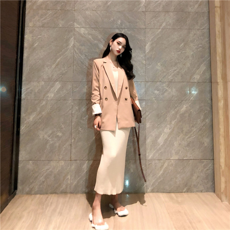 / 韓國復古女神套裝秋兩件套寬松顯瘦西服外套+修身針織吊帶連衣裙
