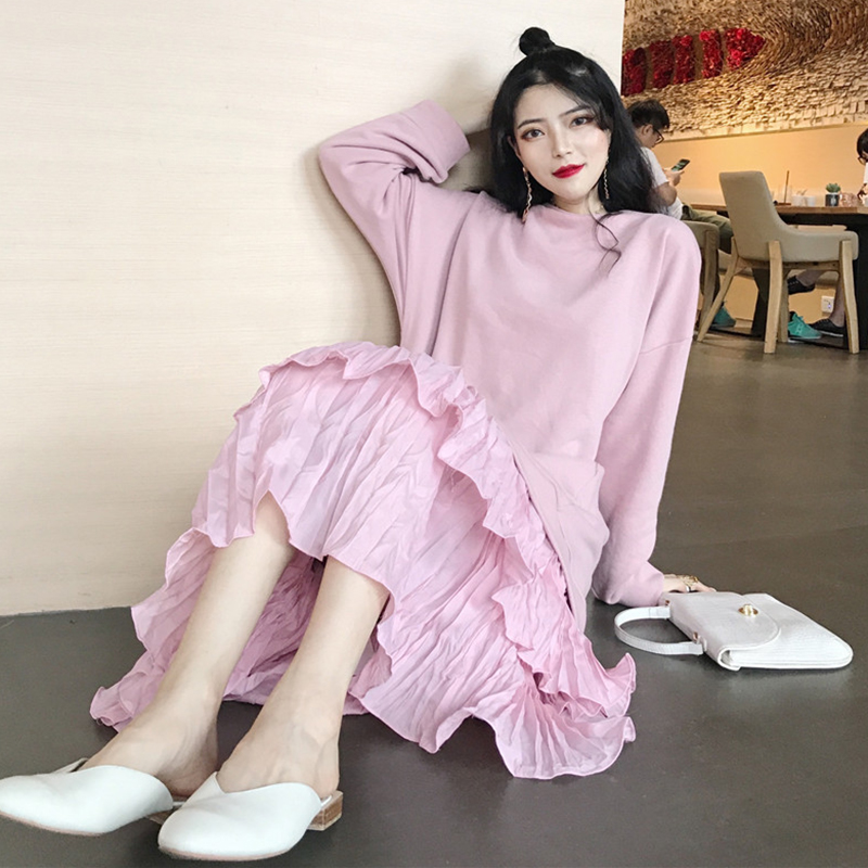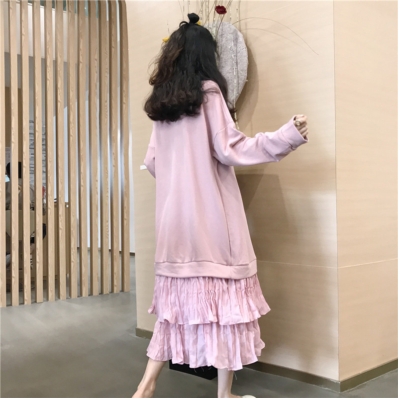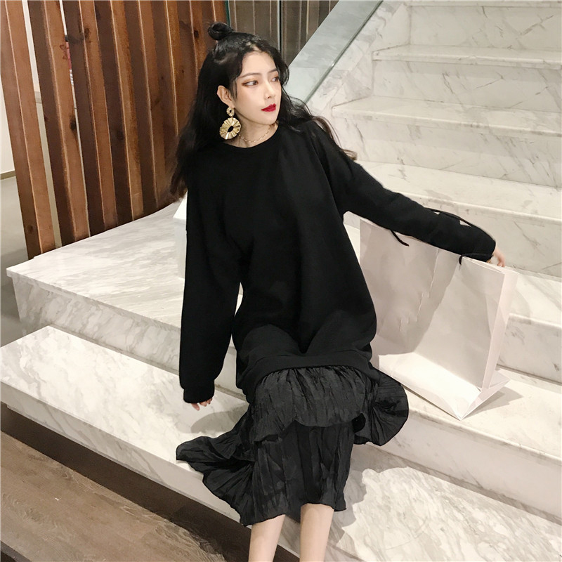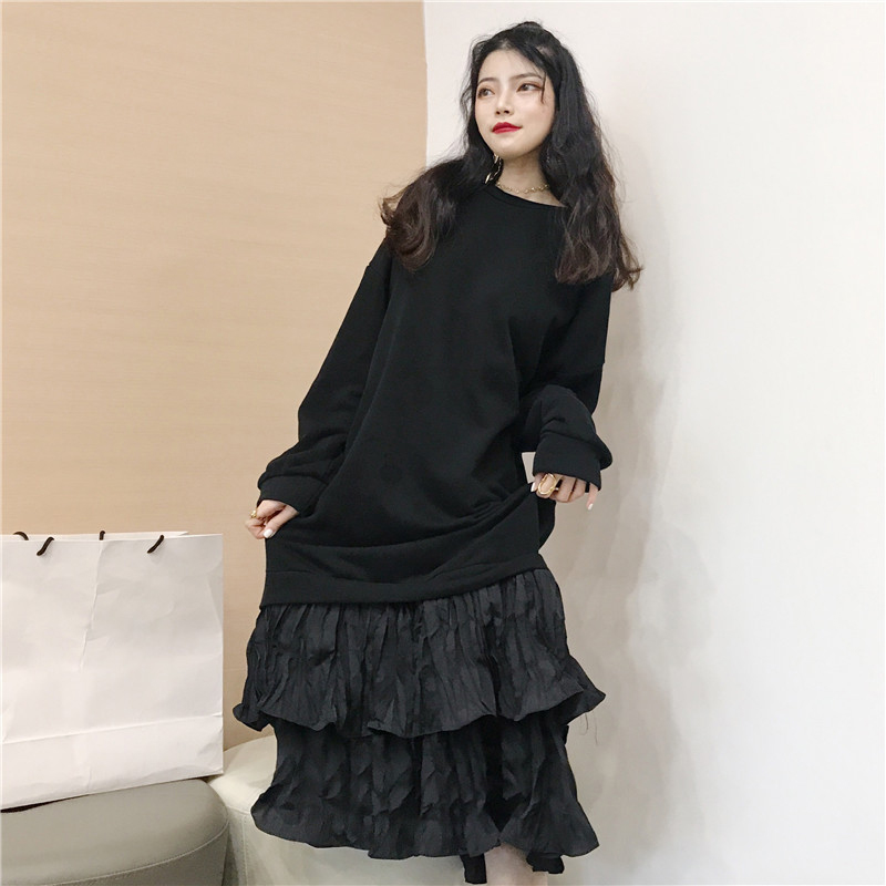 / 假兩件小黑裙秋裝女2018新款寬松長袖拼接中長款休閑a字蛋糕裙子