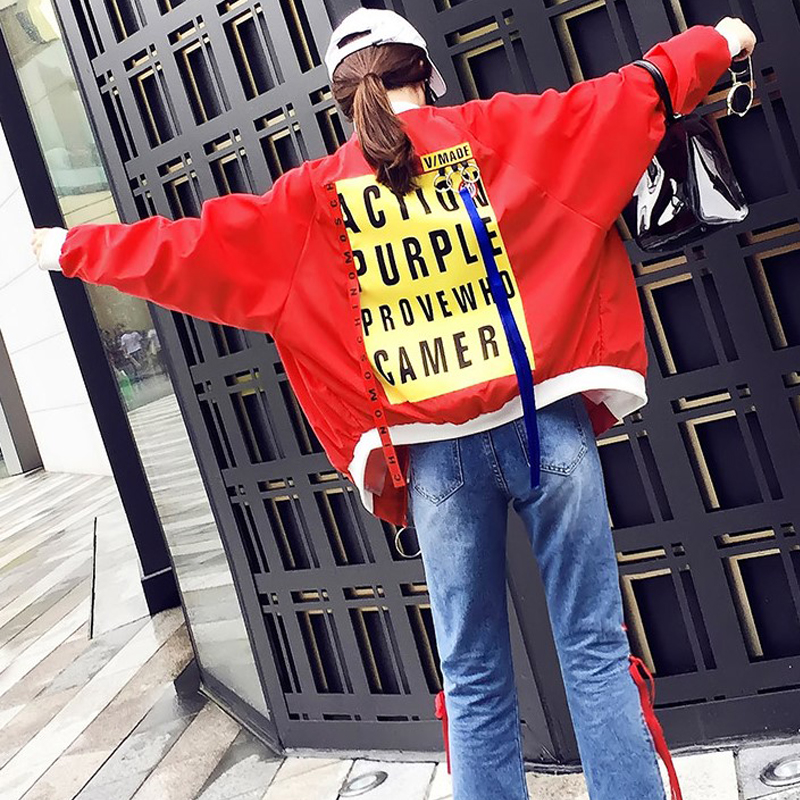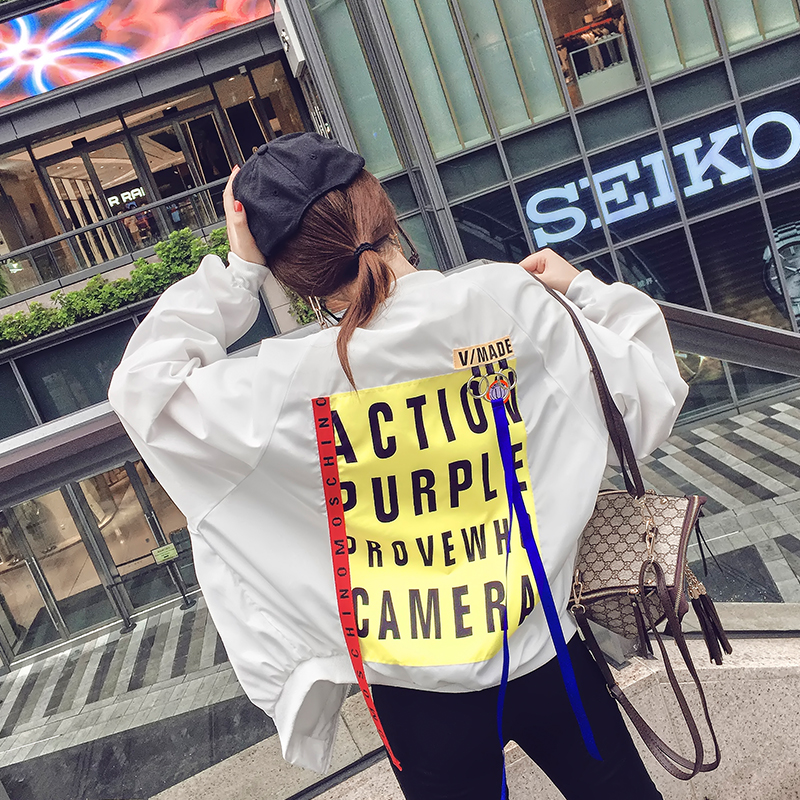 / 短外套女2017春秋印花織帶棒球服學生原宿bf個性寬松立領夾克潮