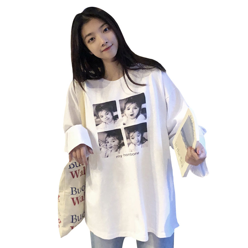 / 秋季女裝韓版中長款原宿風卡通字母寬松百搭長袖休閑顯瘦T恤上衣