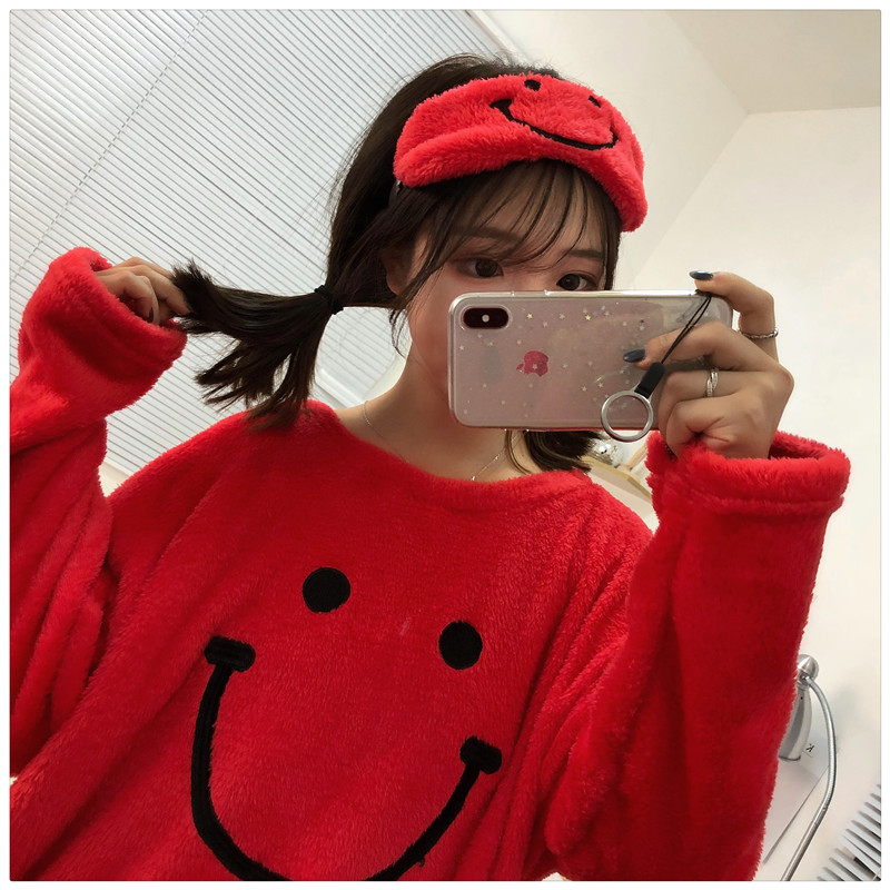 / 秋冬韓版寬松可愛笑臉中長款加厚長袖睡衣連衣裙學生家居服睡裙女