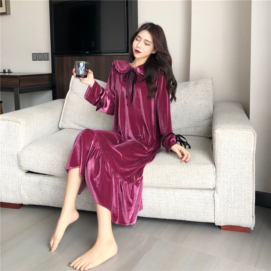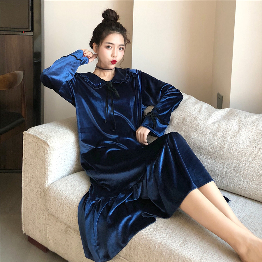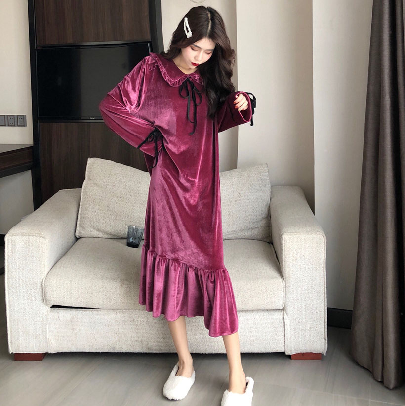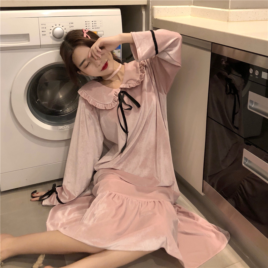 / 2018秋冬新款韓版氣質甜美娃娃領蝴蝶結宮廷風長款休閑睡衣睡裙潮