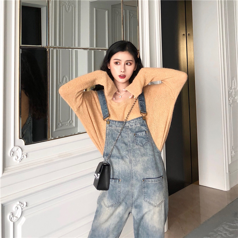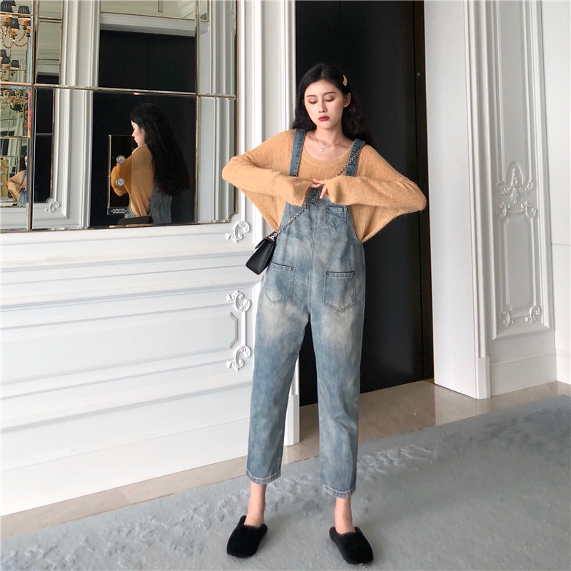 秋裝女2018新款套裝寬松毛衣+牛仔褲勾勾背帶褲高腰寬松九分褲潮