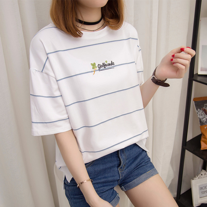 夏裝新款女寬松白色條紋t恤女韓版小清新上衣女夏體恤衫短袖