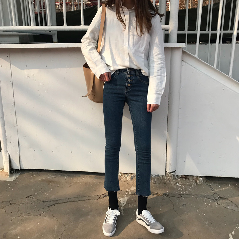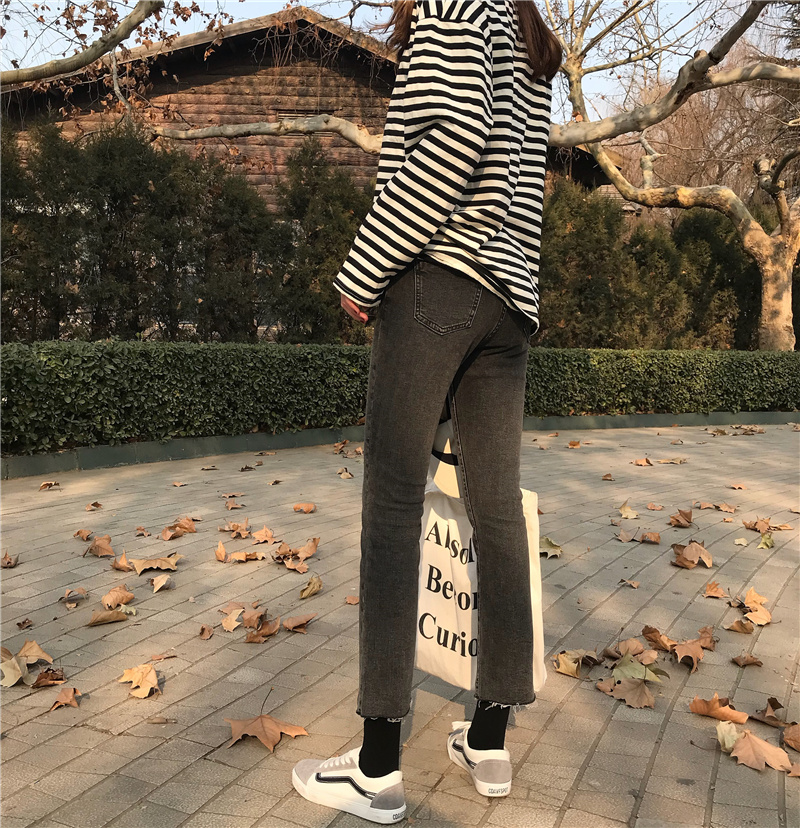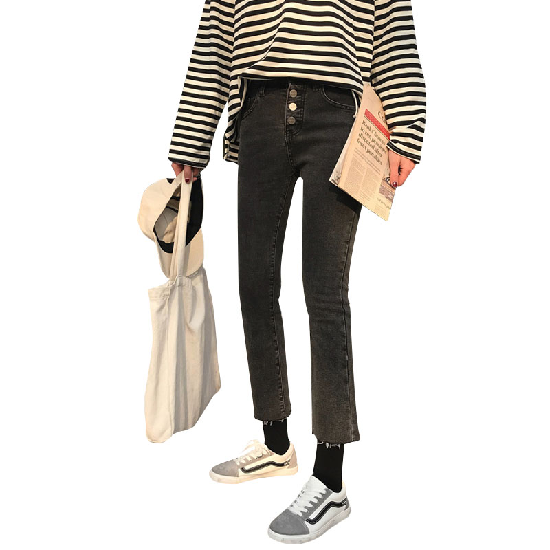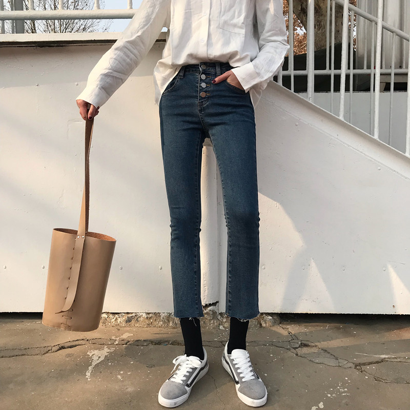 / 秋冬女裝韓版復古做舊高腰修身顯瘦毛邊牛仔褲小腳褲微喇褲九分褲