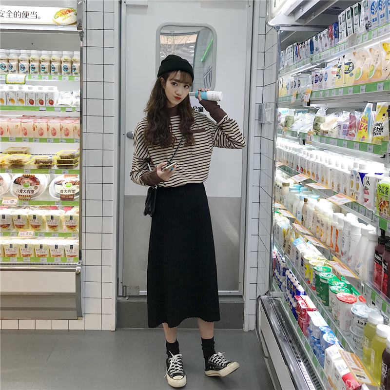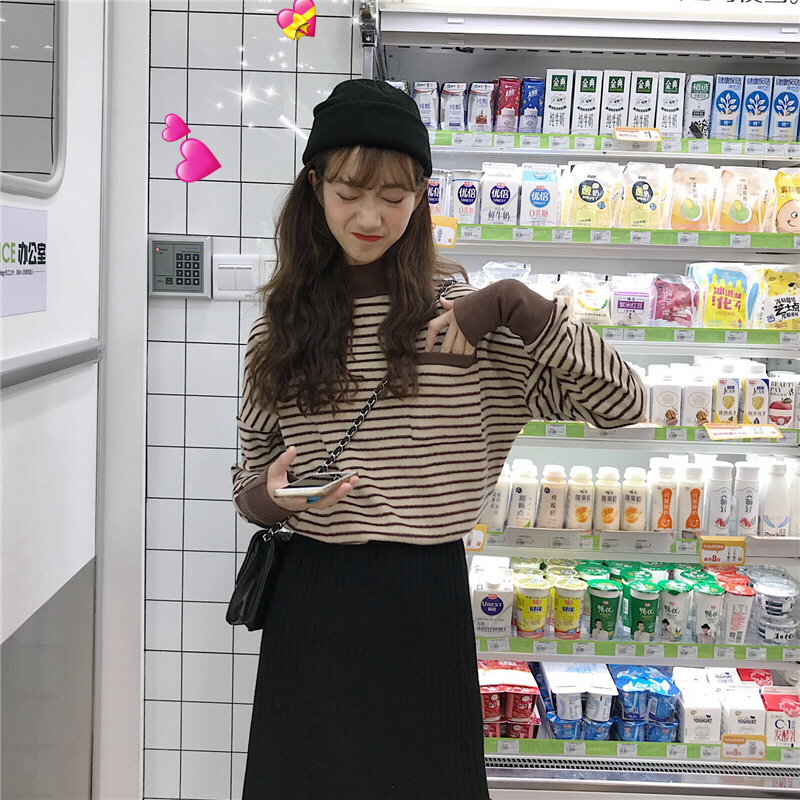 / 2018新款秋冬女裝韓版寬松條紋半高領袖口拼接打底衫套頭衛衣上衣