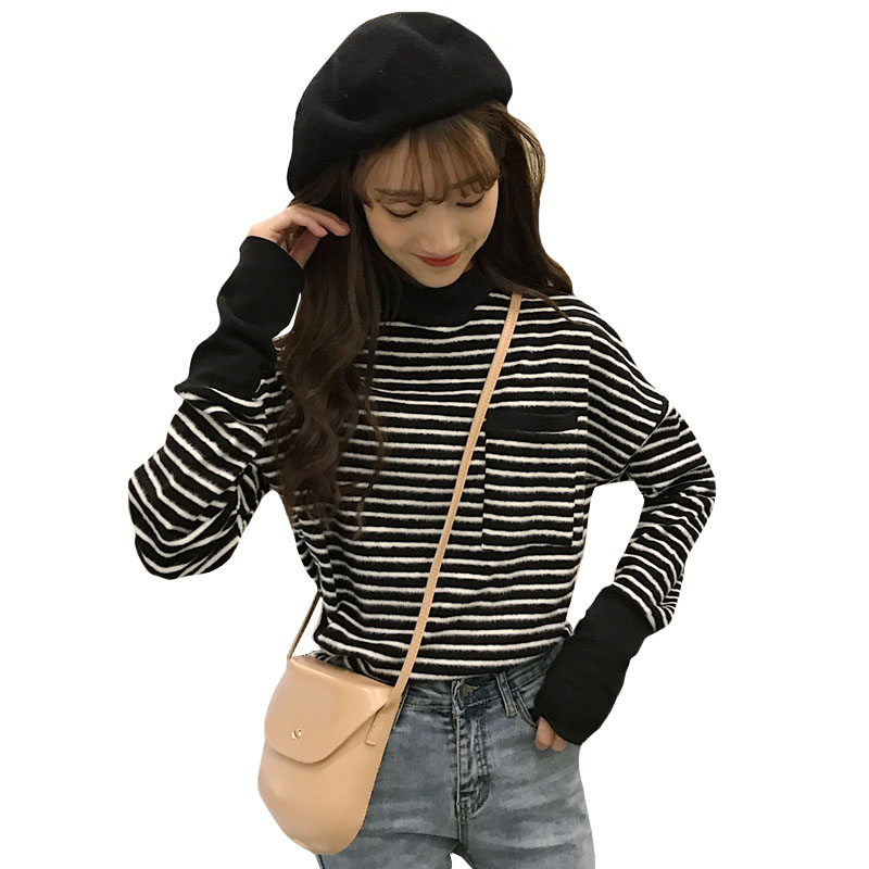 2018新款秋冬女裝韓版寬松條紋半高領袖口拼接打底衫套頭衛衣上衣