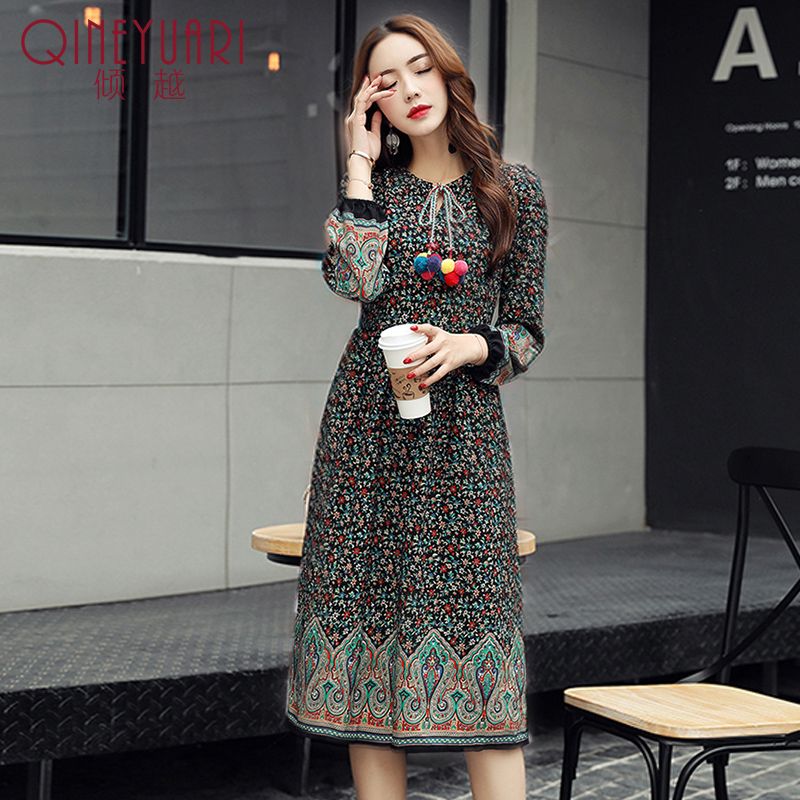 傾越2017春季新款修身小碎花色雪紡連衣裙女裝長袖中長款打底裙子