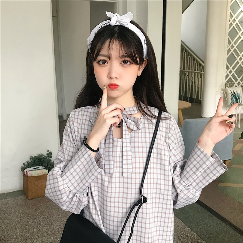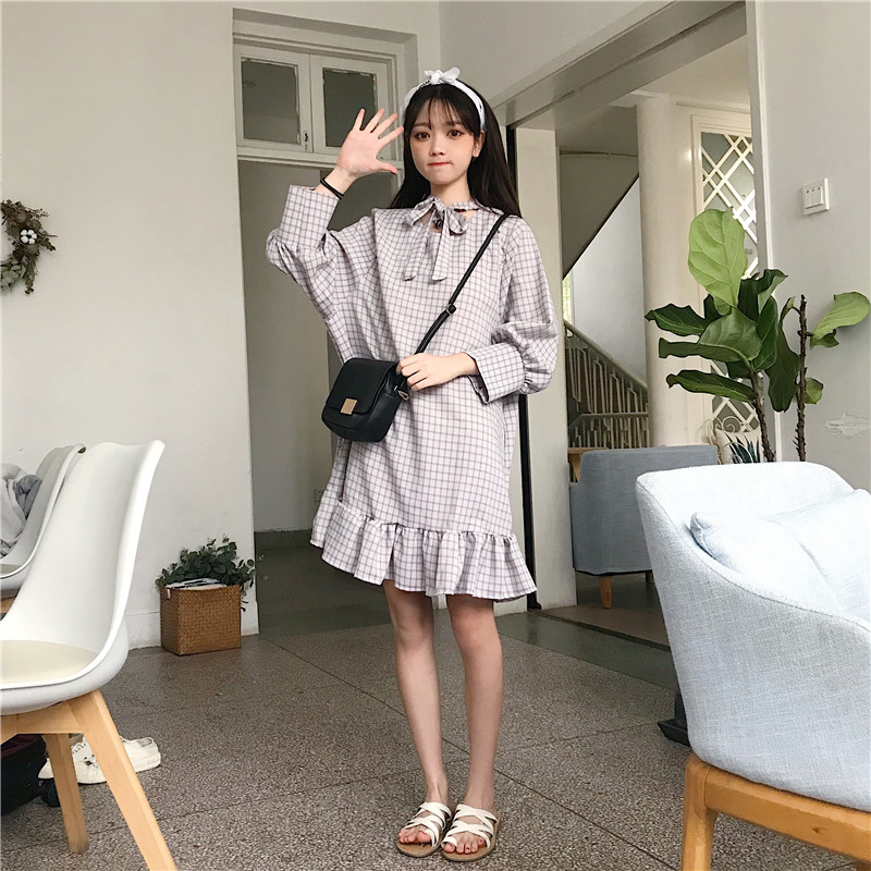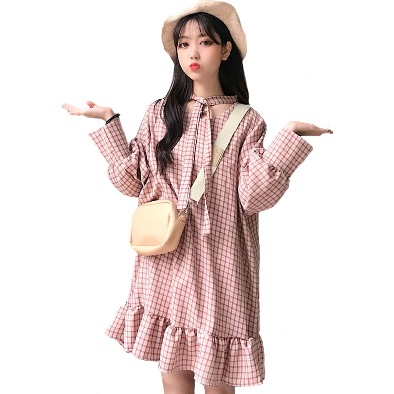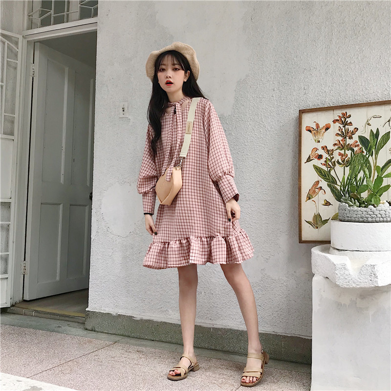 秋裝女裝韓版寬松顯瘦格子綁帶燈籠袖中長款長袖連衣裙打底裙長裙