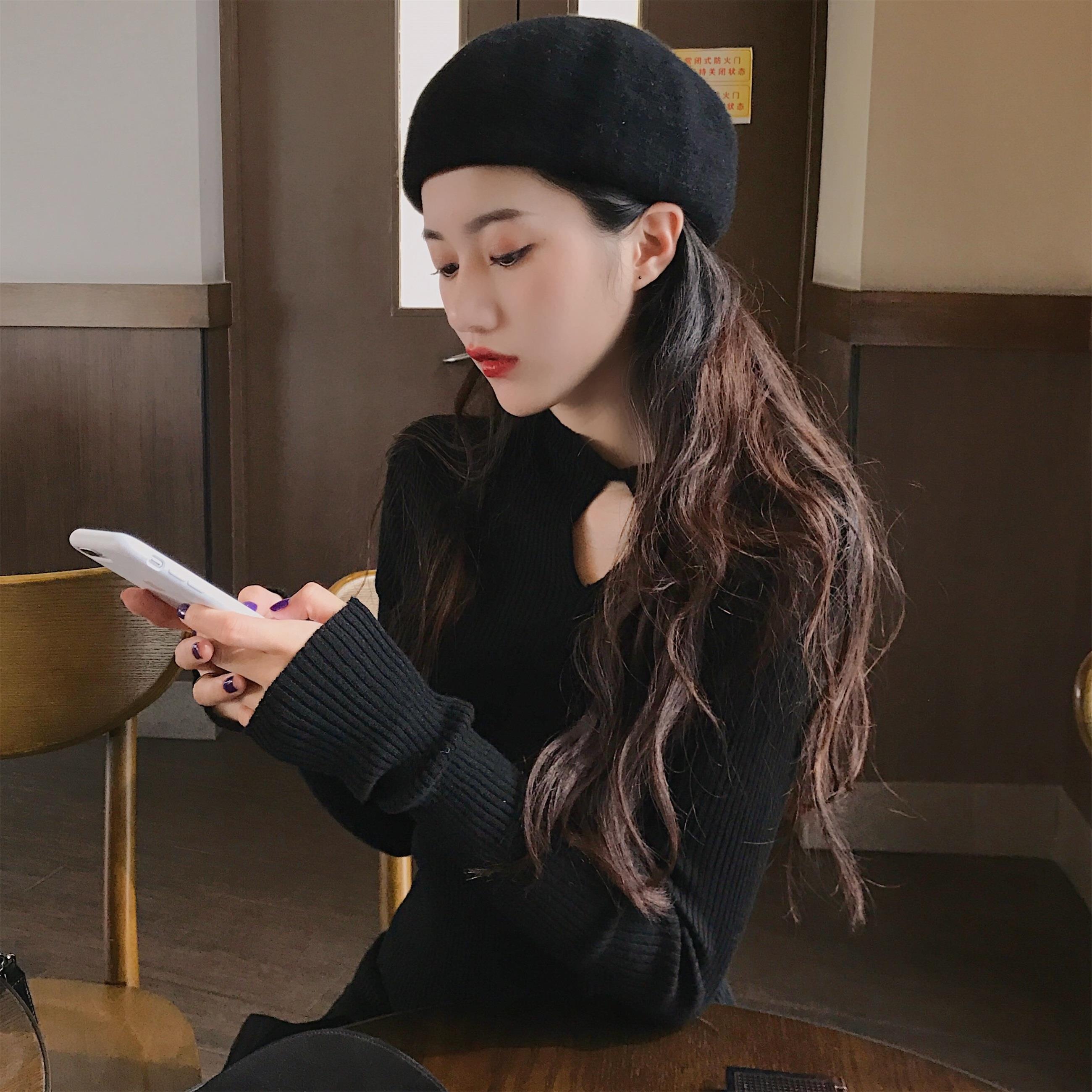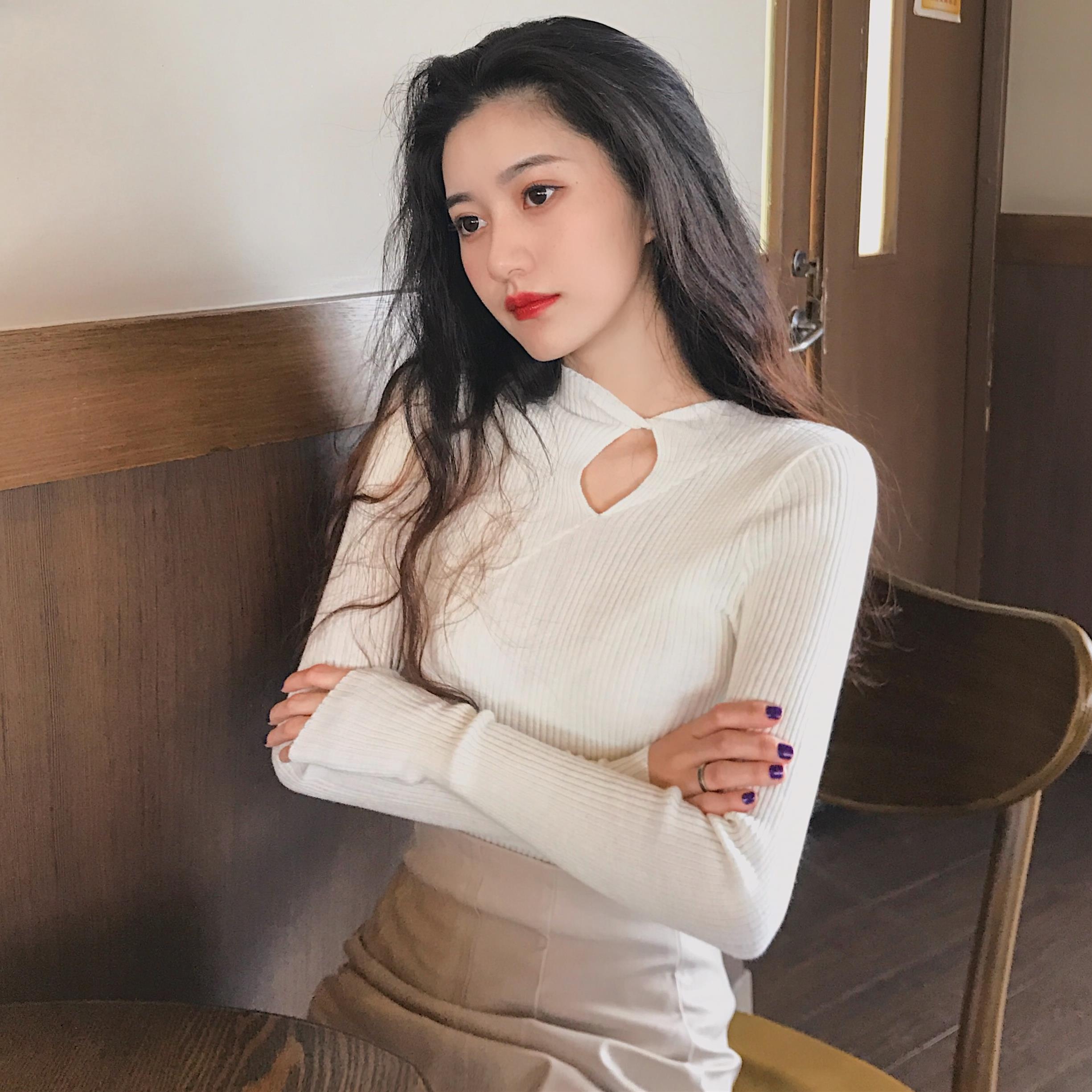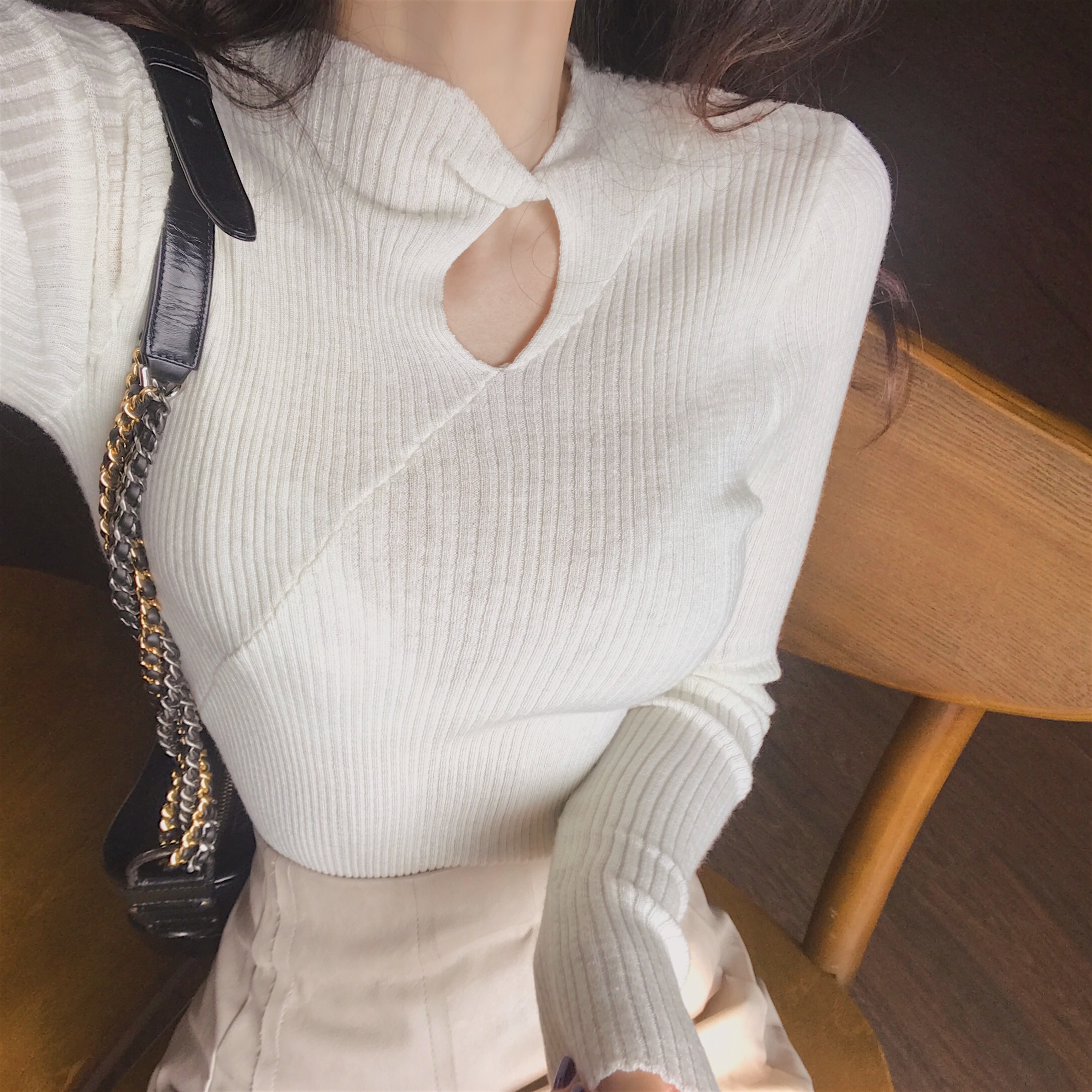 chic秋季新款韓版長袖時尚上衣百搭修身顯瘦鏤空打底針織衫毛衣女