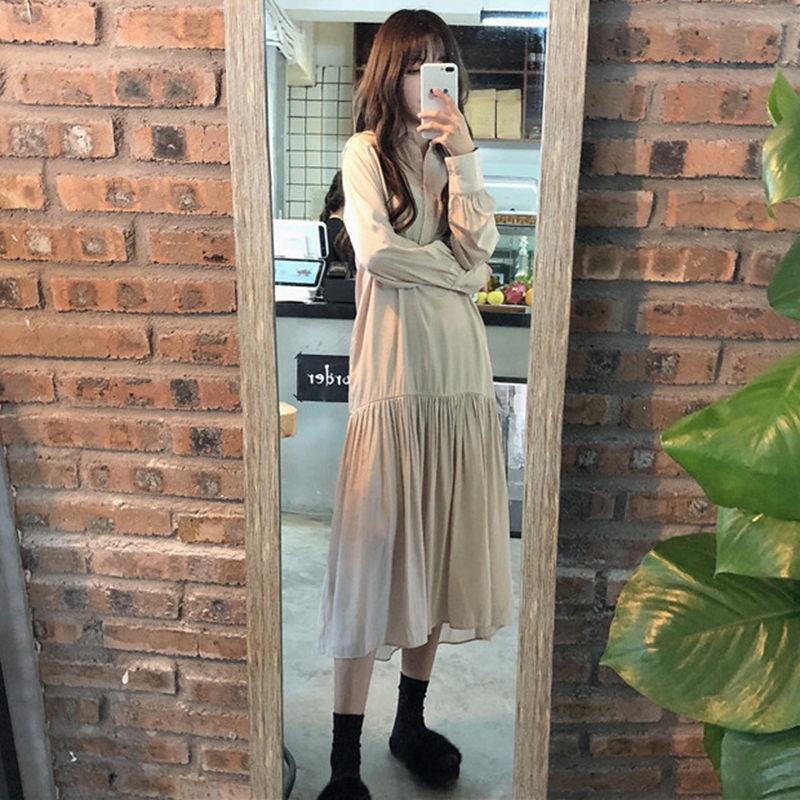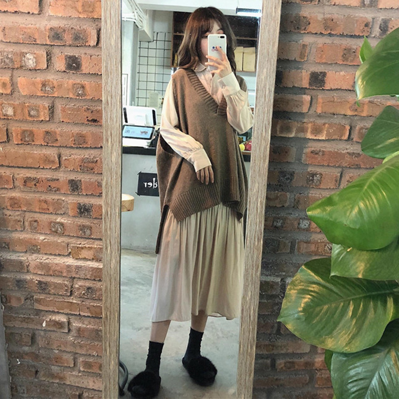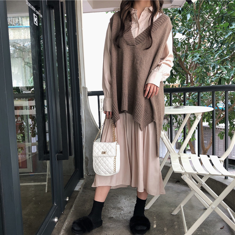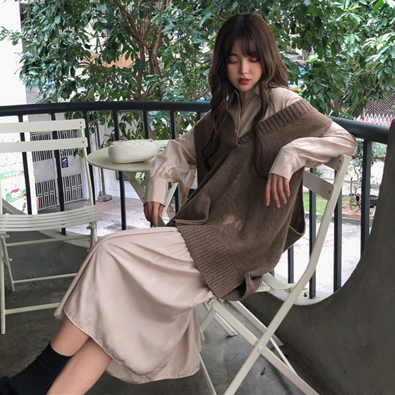 / 時尚套裝女秋新款寬松長袖休閑襯衫式連衣裙學生V領慵懶針織馬甲
