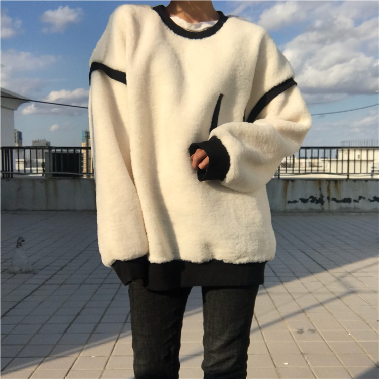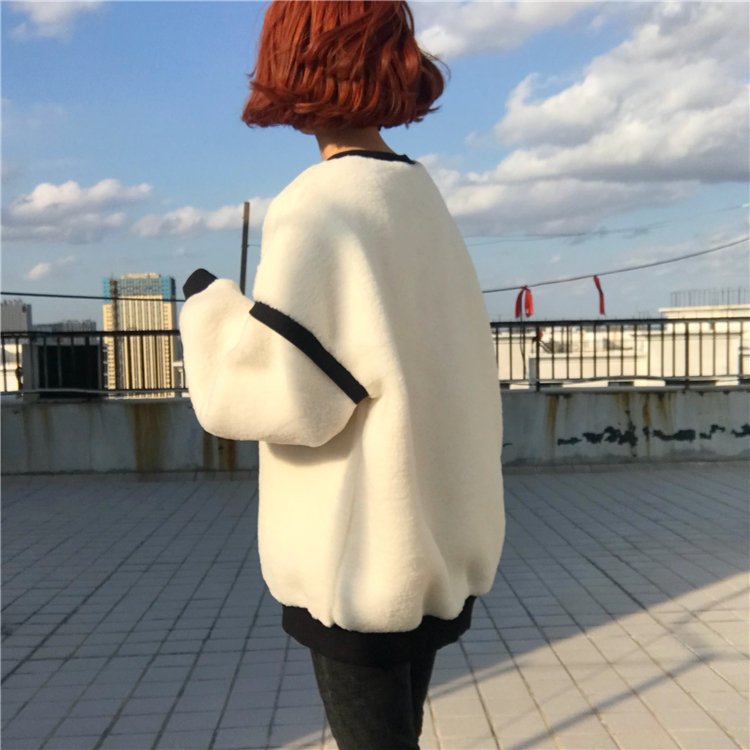 秋冬女裝韓版BF風寬松加厚仿羊羔毛螺紋拼接套頭超火衛衣上衣外套