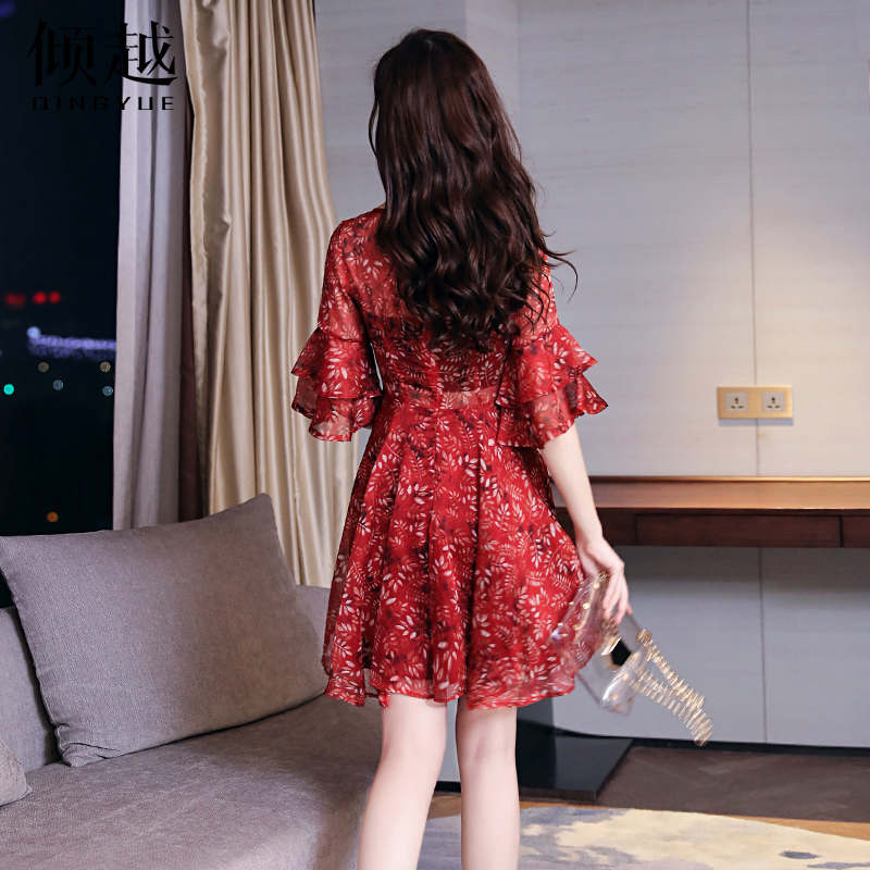 / 2017夏新款女裝韓版修身V領喇叭袖碎花雪紡連衣裙中長款顯瘦a字裙