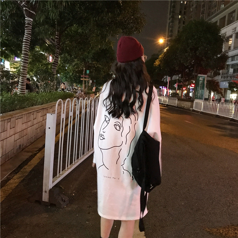 / 韓版時尚百搭秋裝女2018新款寬松顯瘦美女頭像印花字母中長款衛衣