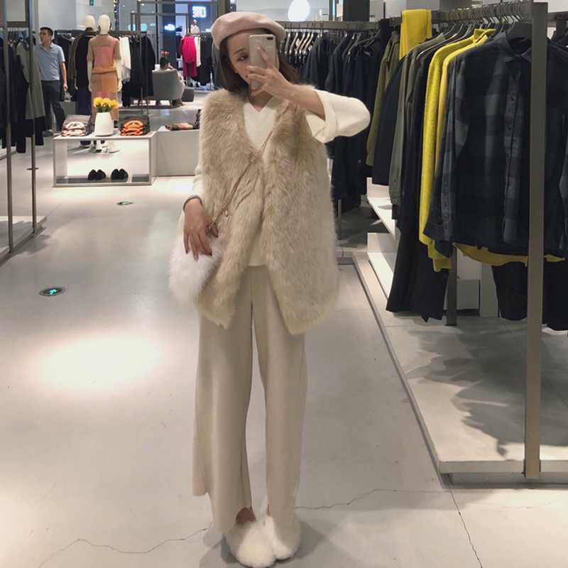 白色毛衣|杏色闊腿褲|杏色毛毛馬甲