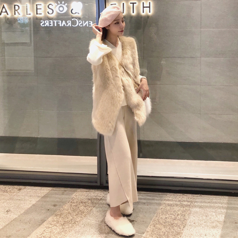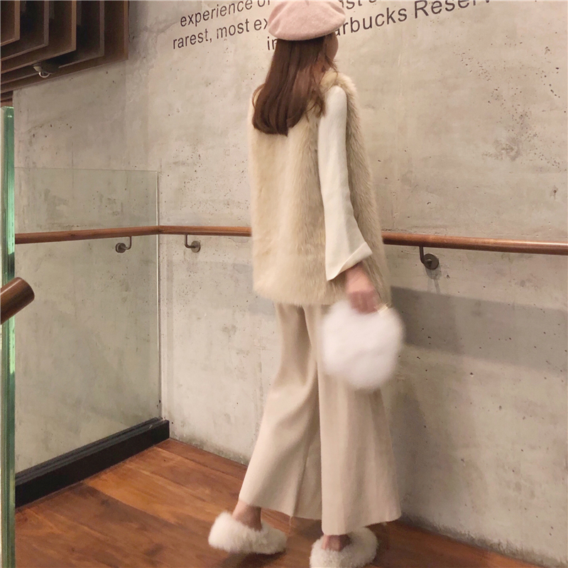 / 洋氣套裝女秋冬2018新款外穿毛絨馬甲V領長袖毛衣寬松毛呢闊腿褲