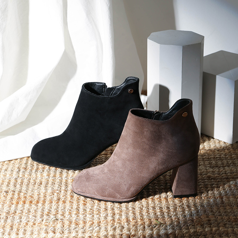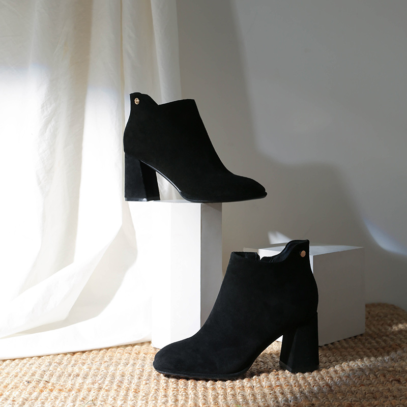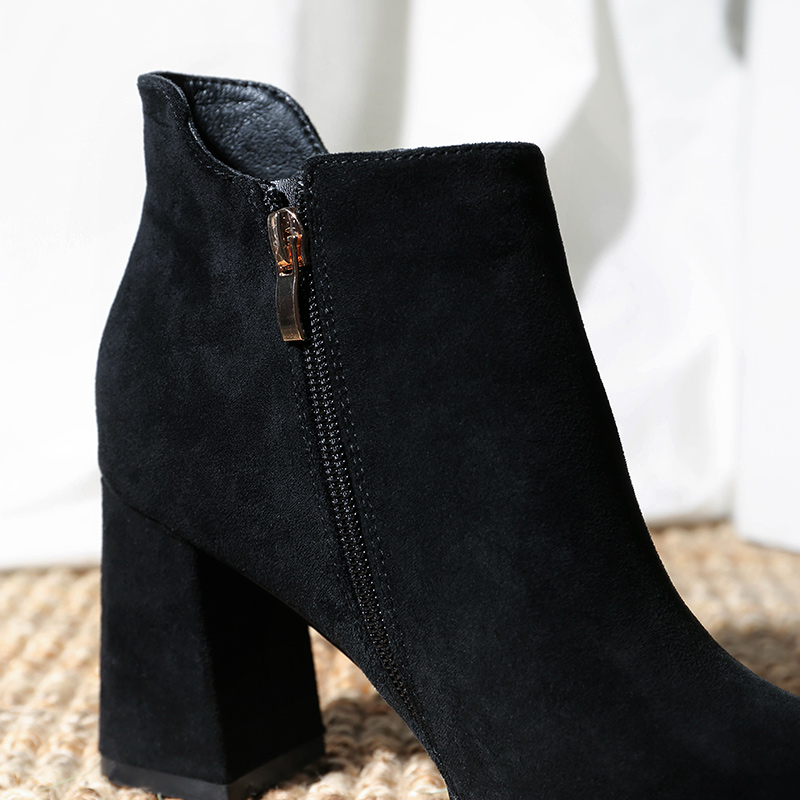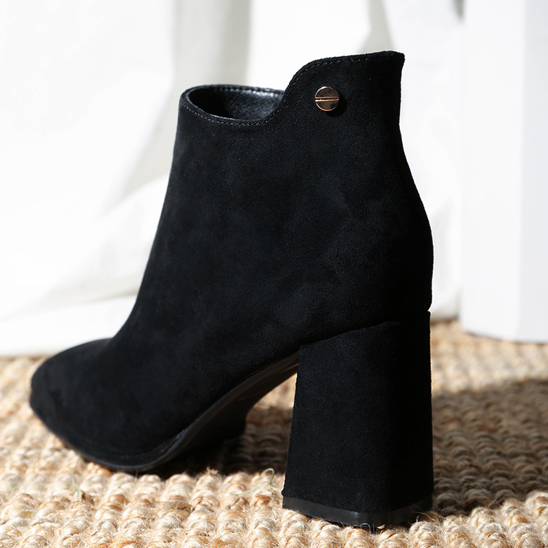 MG小象時尚尖頭高跟鞋2018新款粗跟黑色保暖女鞋冬季時尚磨砂短靴