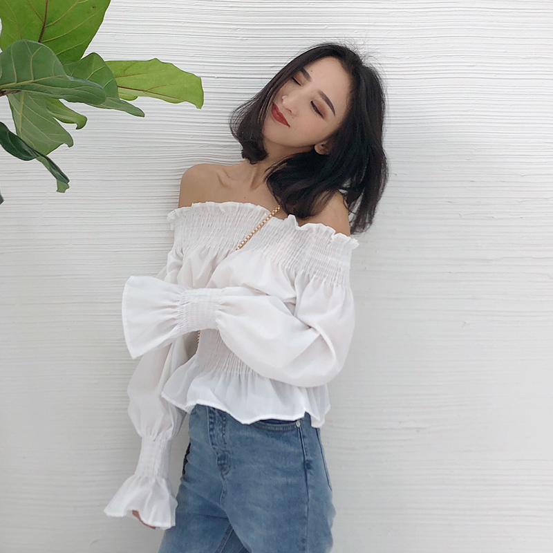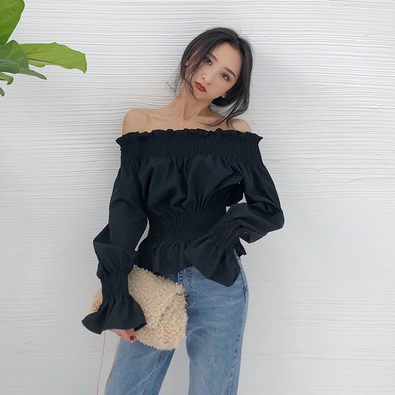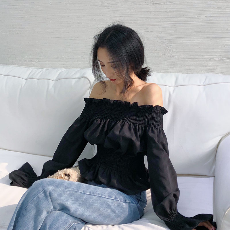 / 秋季新款復古韓國落肩花邊一字肩長袖上衣顯瘦褶皺套頭氣質襯衫女