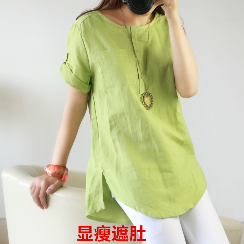 短袖棉麻T恤女寬松 2017夏裝新款女裝潮韓版大碼休閑亞麻襯衫女式