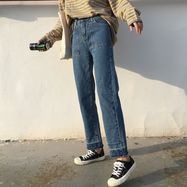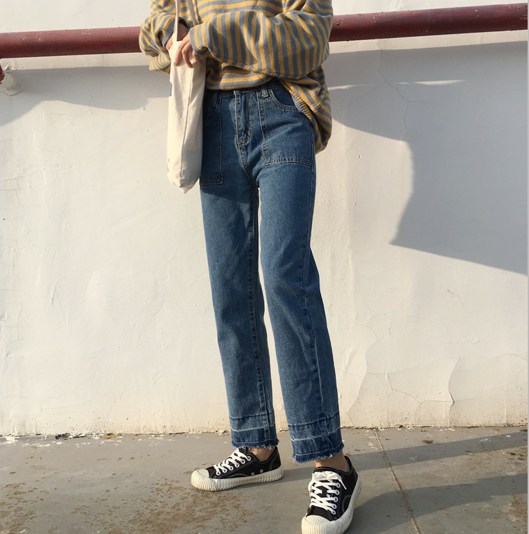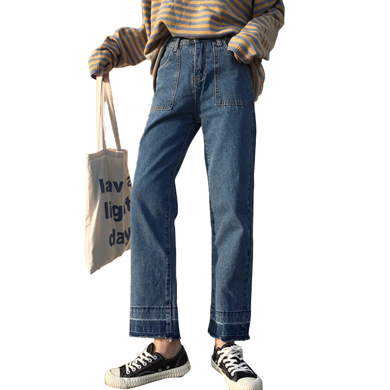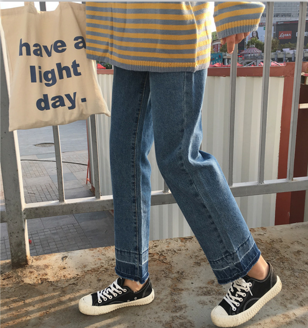 / 秋裝女裝新款韓版高腰寬松毛邊牛仔褲顯瘦九分褲闊腿褲學生長褲潮