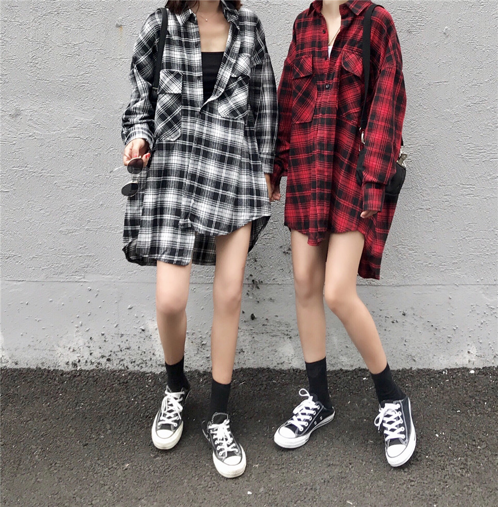 / 港味chic百搭寬松慵懶風秋季新款小清新外套復古中長款格子襯衫女