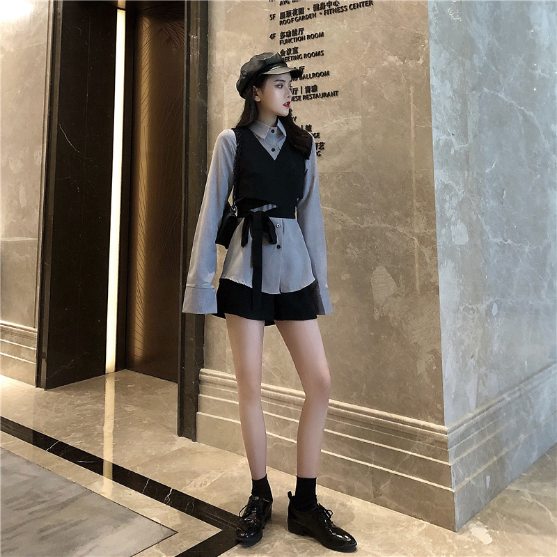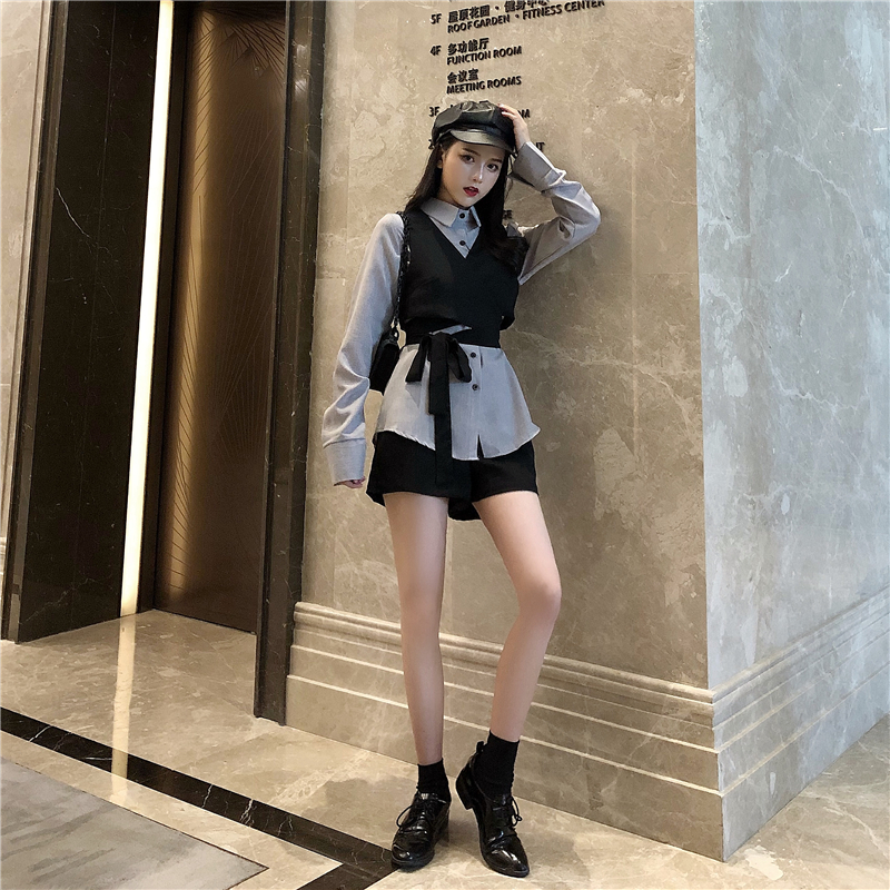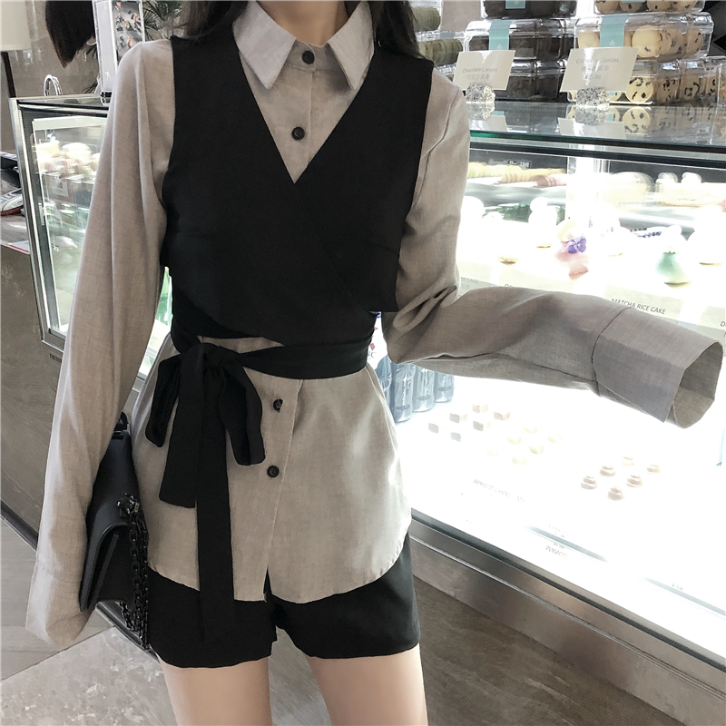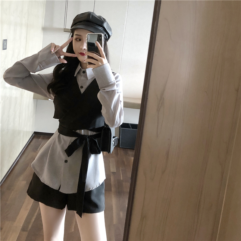 / 2018秋裝新款韓版百搭小香風長袖襯衫短款綁帶馬甲休閑短褲套裝女