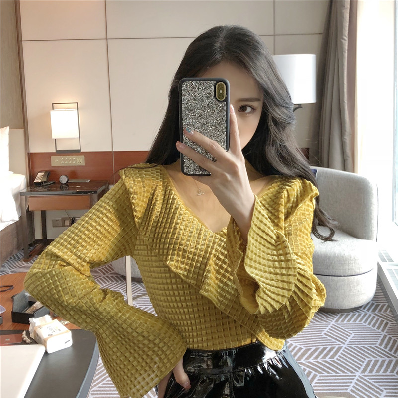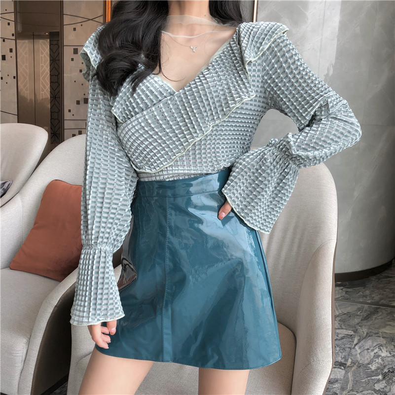 chic早秋溫柔荷葉邊超仙上衣港味高腰漆皮半身裙時尚套裝兩件套女