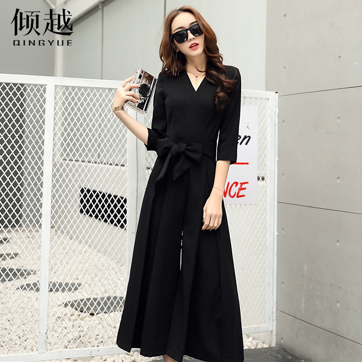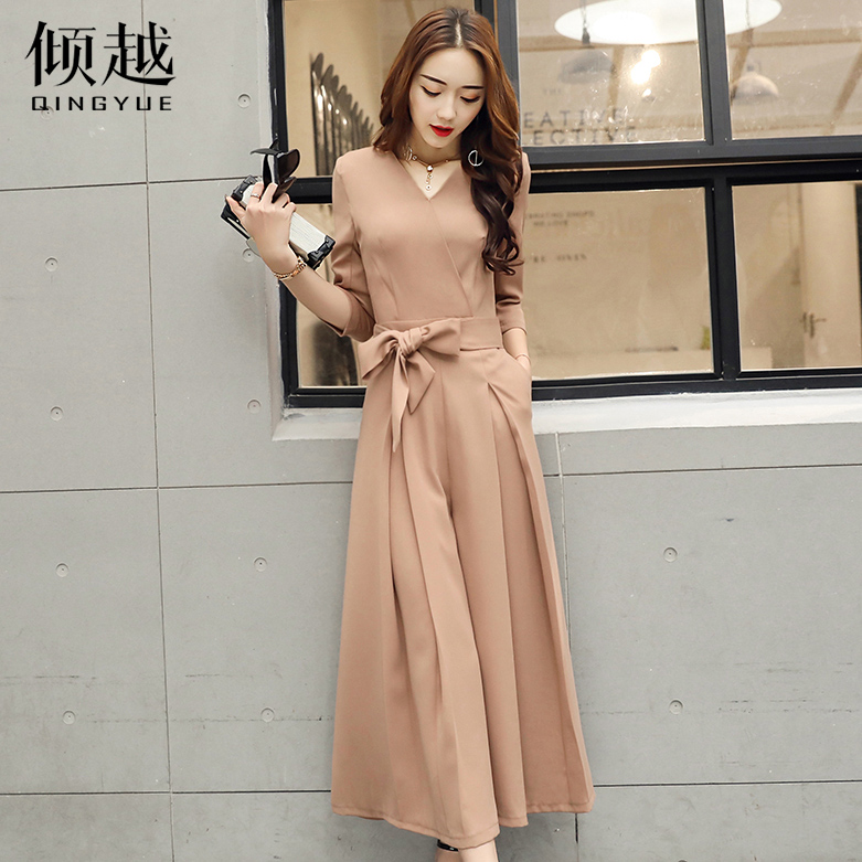 傾越連體褲夏季女2017新款韓版高腰V領七分袖腰部系帶闊腿褲套裝