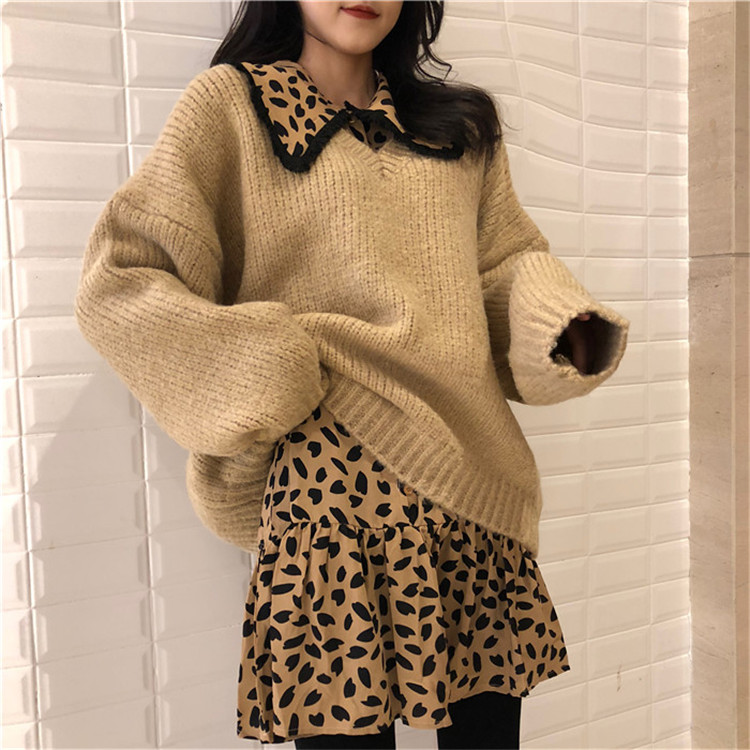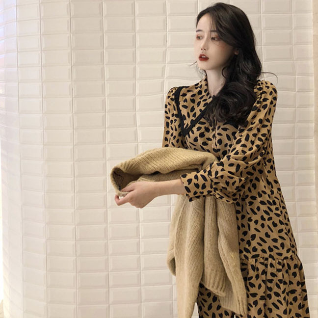 / 韓版復古流蘇娃娃領豹紋收腰連衣裙+圓領套頭毛衣女秋冬2018新款