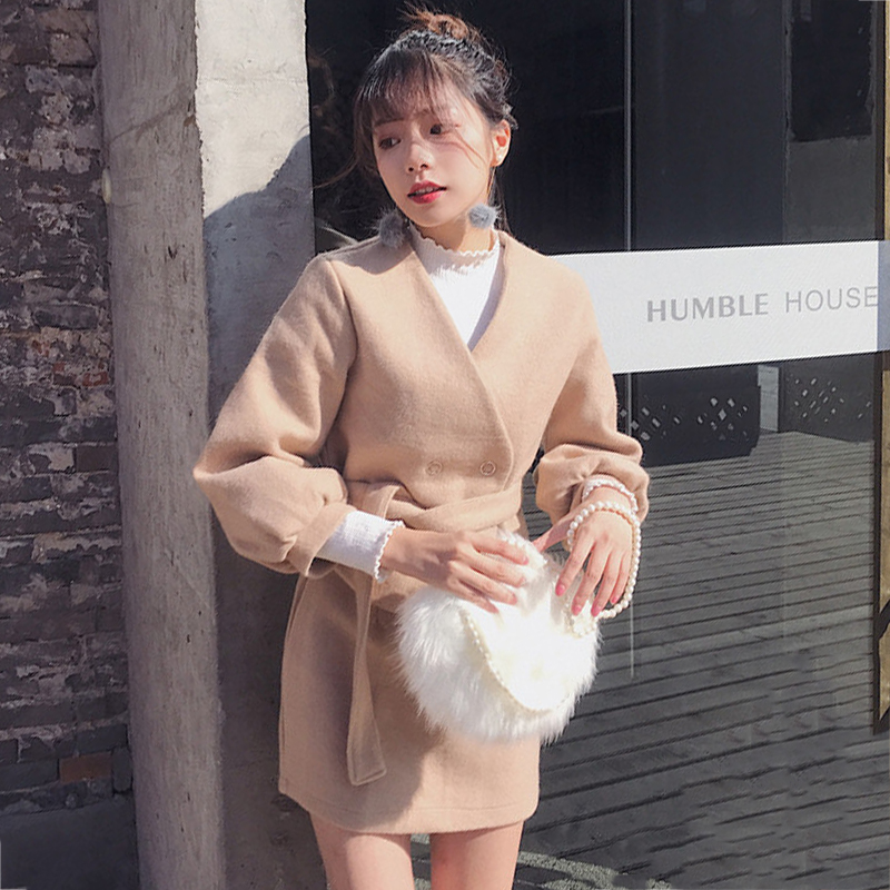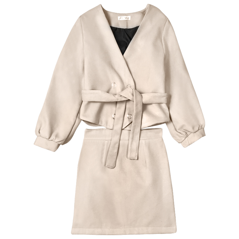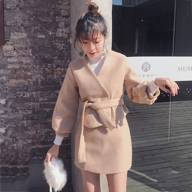 秋冬女裝新款長袖綁帶毛呢短外套開衫+高腰a字半身裙短裙子兩件套