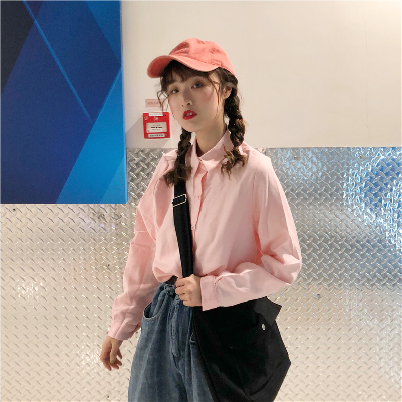 / 秋季女裝韓版寬松學生百搭上衣基礎純色少女休閑長袖襯衫時尚襯衣