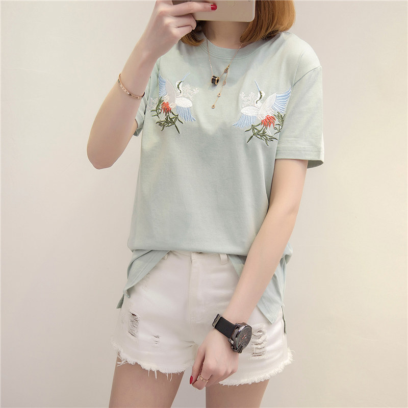 春季新款女裝上衣刺繡白色t恤女短袖寬松韓版打底體恤衫女潮