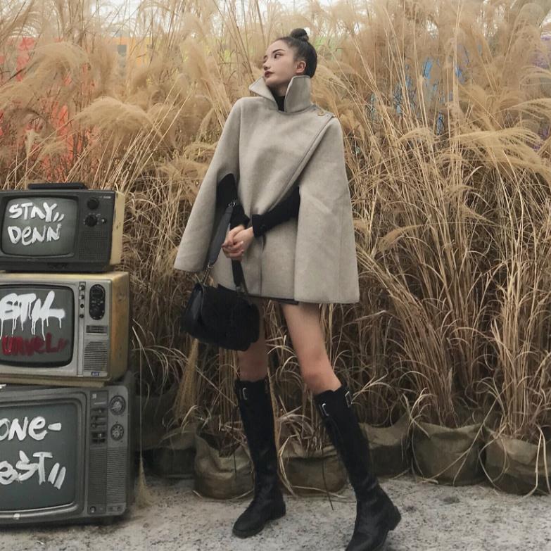 新款時尚套裝寬松斗篷短款呢子外套百搭純色針織打底衫chic兩件套