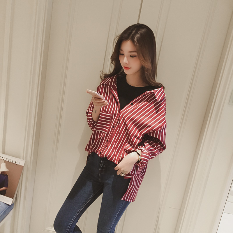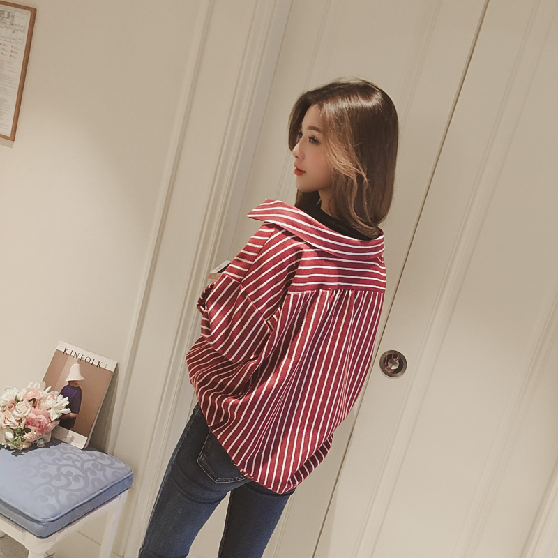 / 韓版夏季新款圓領豎條紋襯衫女長袖中長款襯衣寬松假兩件上衣外套