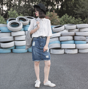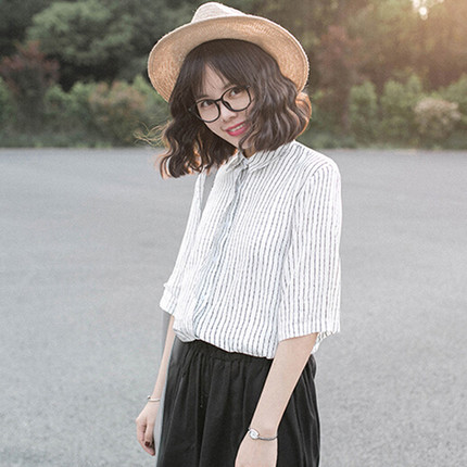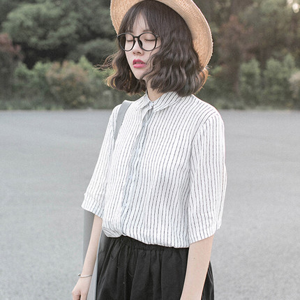 / 2017春裝新款學院風寬松顯瘦學生襯衣 韓版豎條紋翻領中袖襯衫女