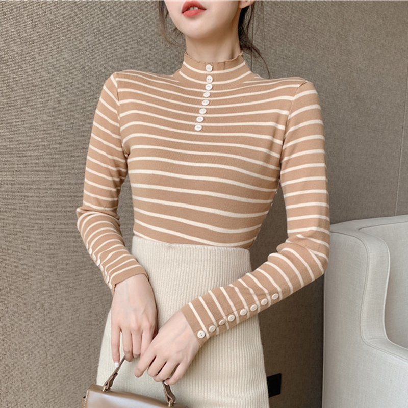 / 時尚條紋上衣修身顯瘦打底針織衫女秋冬裝新款小高領外穿套頭毛衣