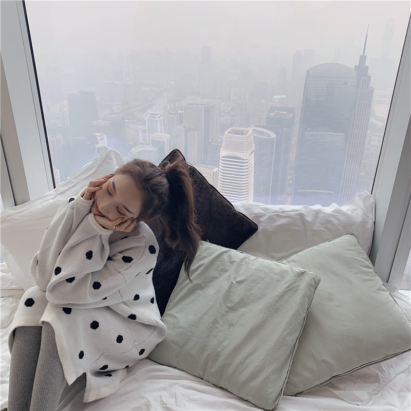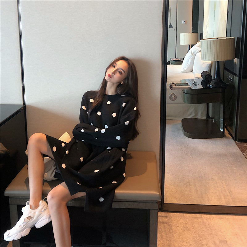 / 連衣裙女秋冬新款chic慵懶風寬松厚實波點長袖圓領中長款毛衣裙潮