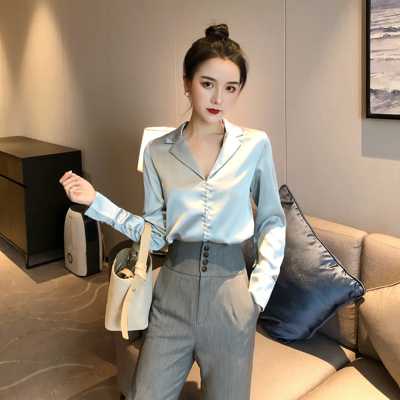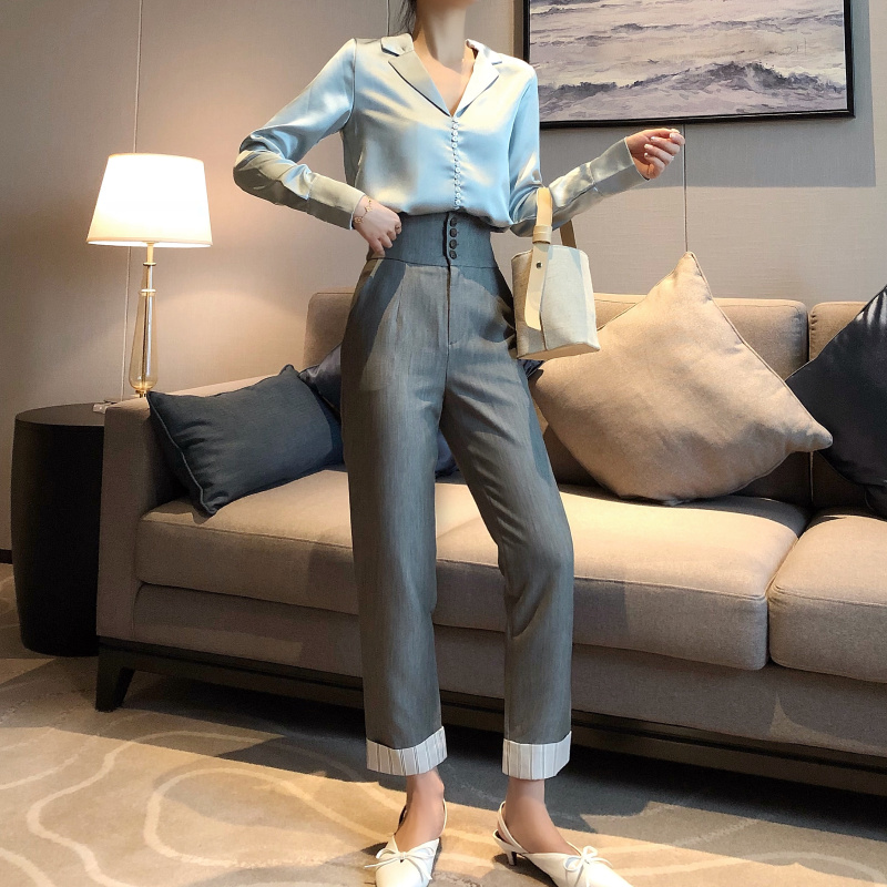 早秋緞面襯衫女秋裝上衣心機襯衣卷邊哈倫褲小腳休閑九分褲套裝潮