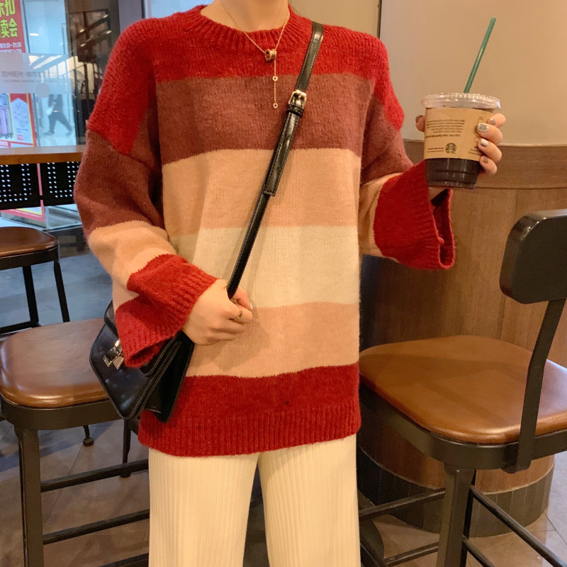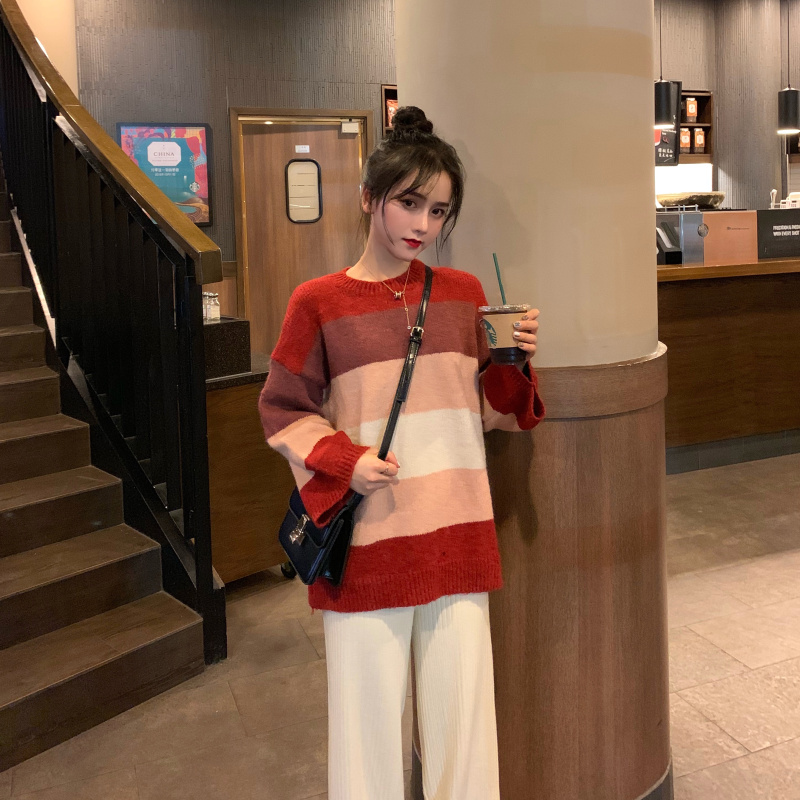 / 慵懶溫柔拼色針織衫+簡約純色高腰松緊腰綁帶長褲針織褲女兩件套