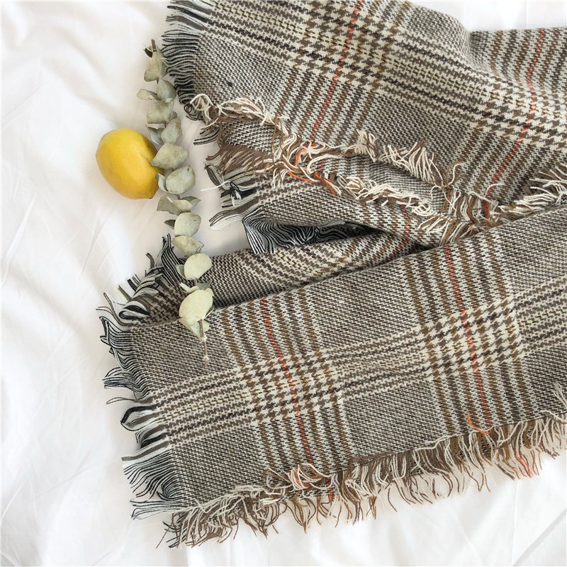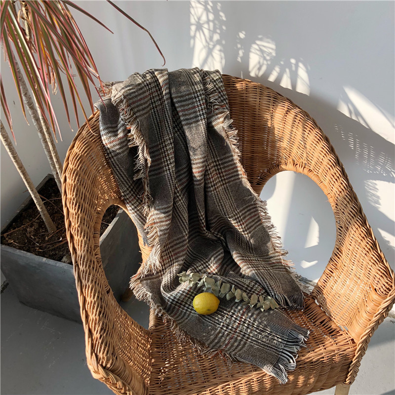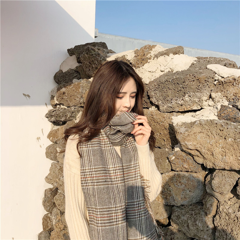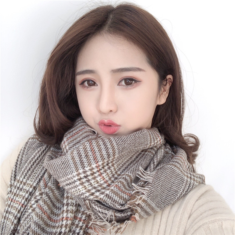 / 韓版仿羊絨圍巾女秋冬時尚新款經典千鳥格子毛須針織長款加大披肩