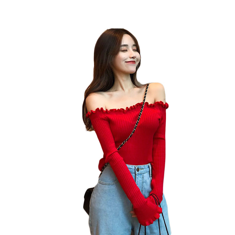 韓風秋裝女2018新款一字露肩木耳邊長袖針織衫修身短款打底上衣潮