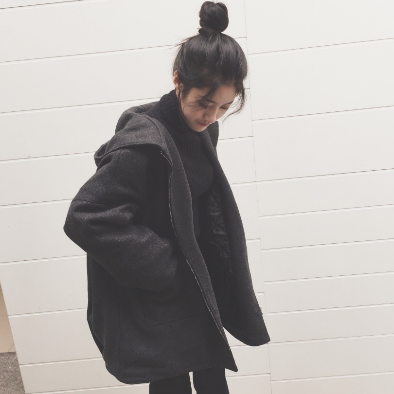 / 冬裝新款寬松連帽加厚毛呢外套女復古港味chic加厚保暖呢子大衣潮