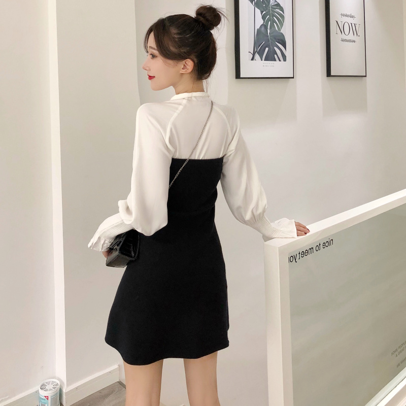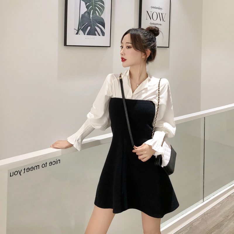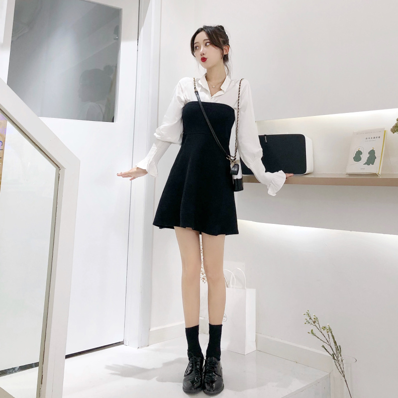 新款韓版泡泡袖寬松漏鎖骨襯衣+黑色針織高腰半身裙抹胸包臀裙女